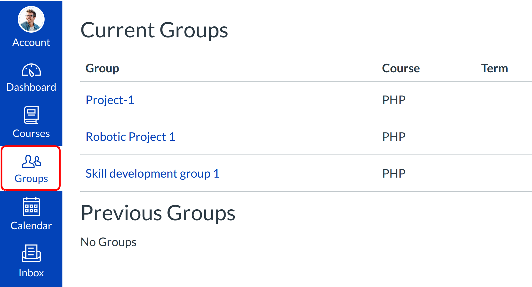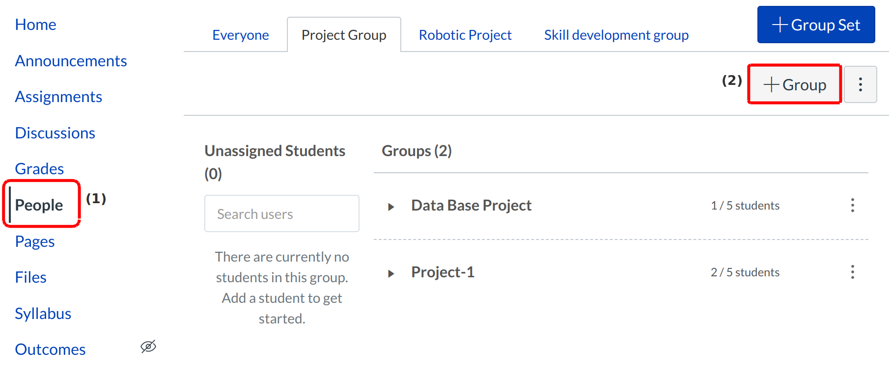 Click People from course navigation [1] and create a new group [2] or Find and select the group you want to view Files for.