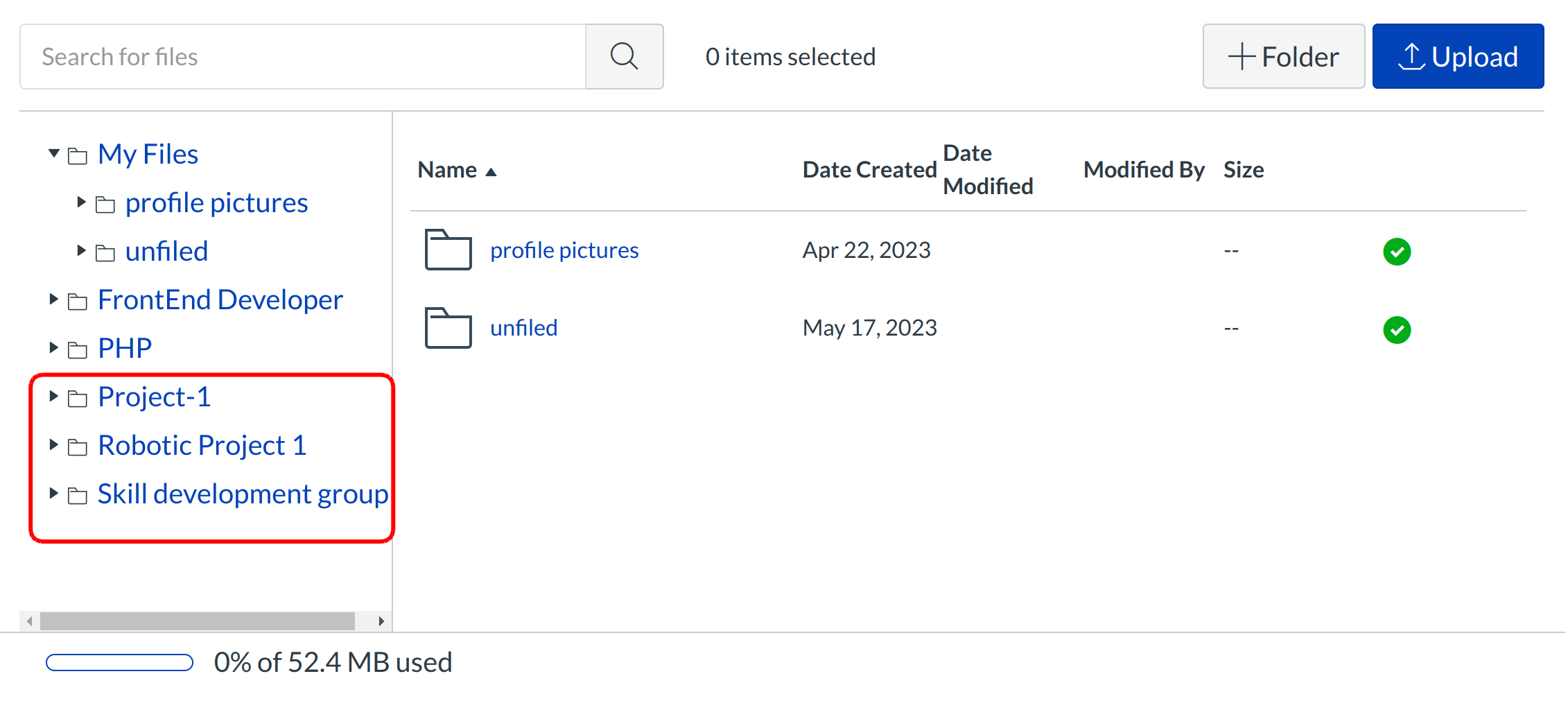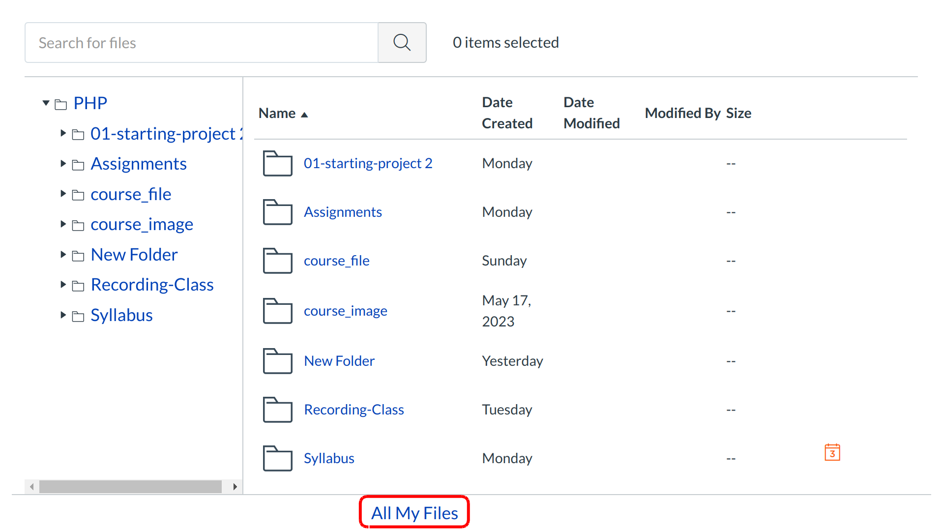 Note: If you want to see the Files for all your courses and/or groups, click the All My Files link.