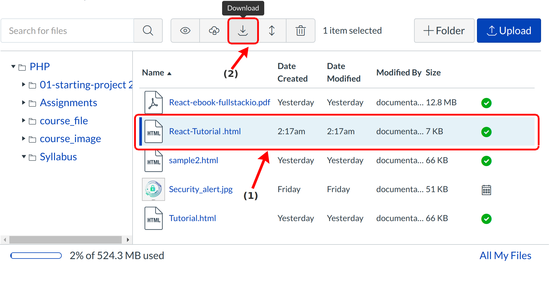 Hover over the HTML file link and download [1]. Otherwise click on the Download link [2] to download the file.