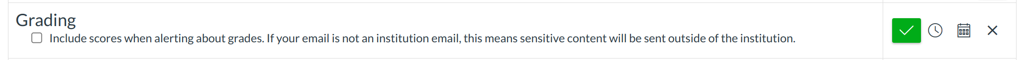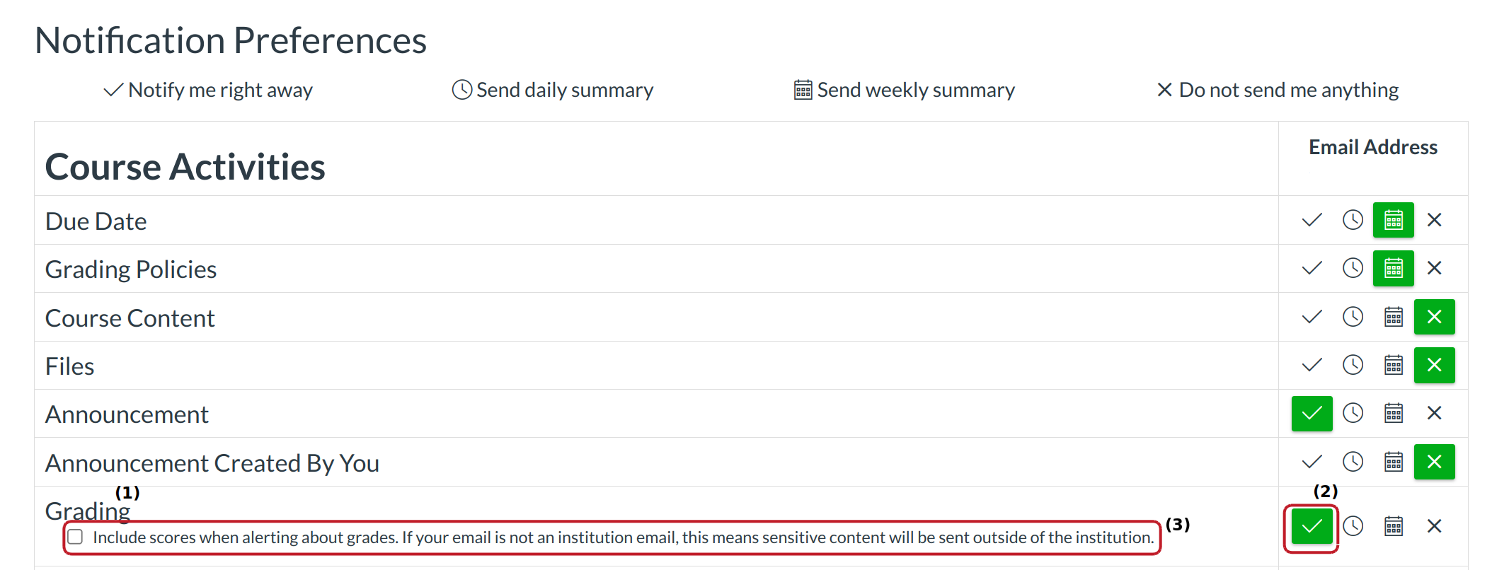 Find the Grading notification row [1]. Set the notification preference for each column by clicking on the appropriate icon [2]. If appropriate, click the Include scores when alerting about grade changes check box [3].