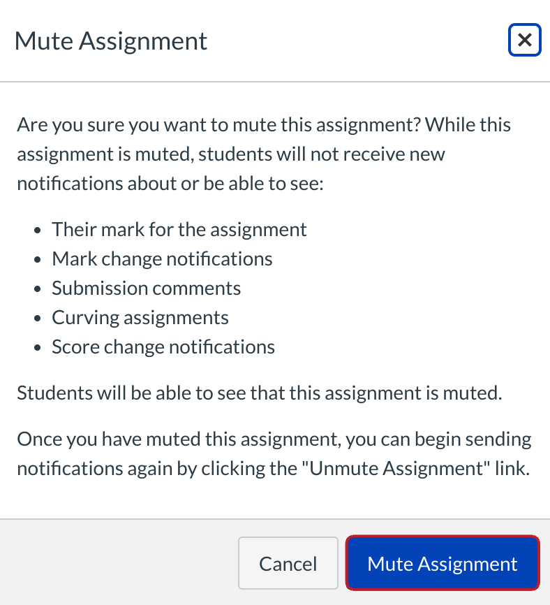 Click the Mute Assignment button. Students will be unable to view their grades, including grade and score changes, submission comments, and curved assignments for the assignment.