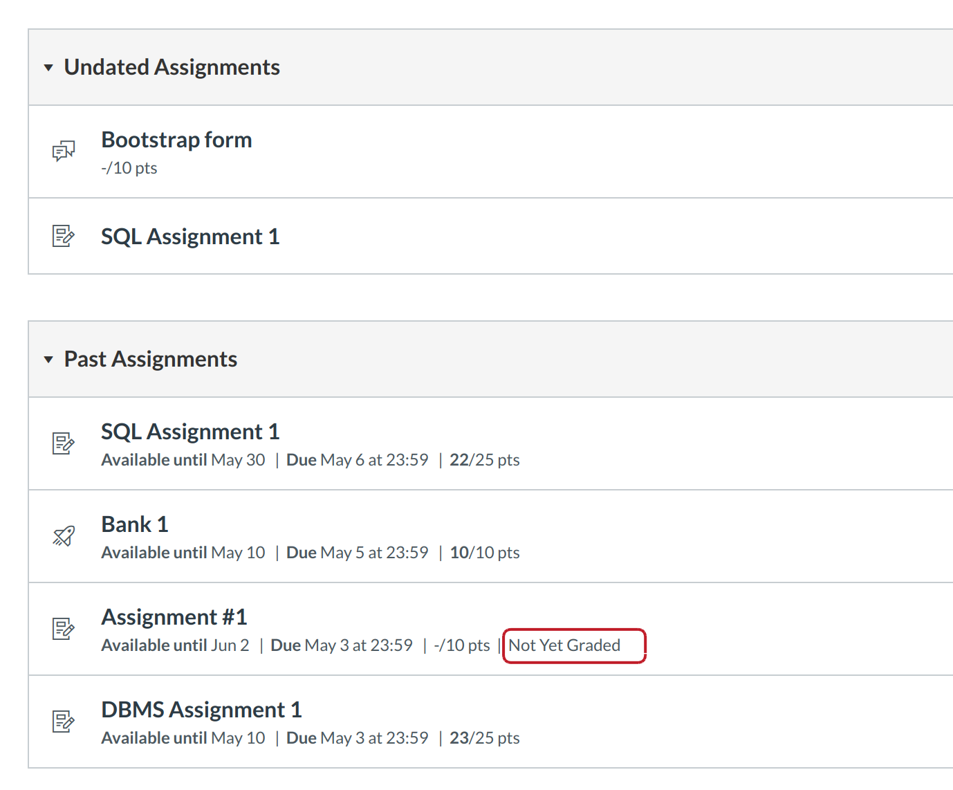 View the Not Yet Graded next to the assignment title. A popup dialog informs the student that the Instructor is working on the grades for that assignment.
