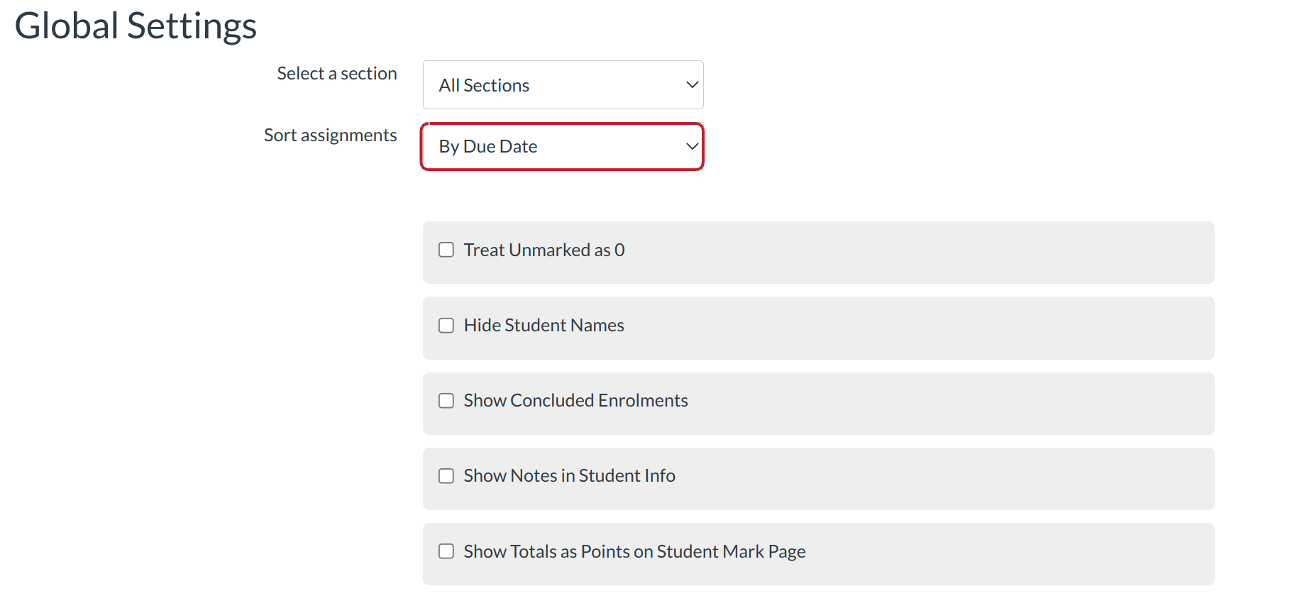 You can sort the Gradebook by assignment due dates, student names, secondary id, total scores, individual assignment, and if you have assignment groups set up, you can sort the total scores by assignment groups. You can also resize and rearrange the columns in the Gradebook.