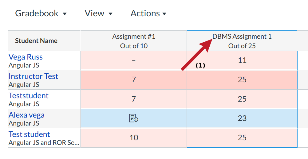 Click the Arrange columns By due date link [2] to arrange the columns in the Gradebook by due dates.