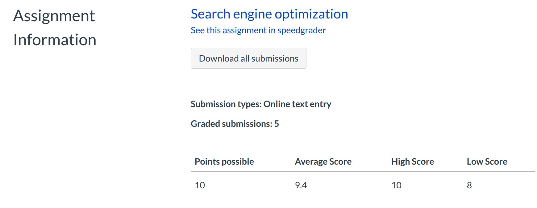 View the details for the assignment. You can see the average score, high and low score, and the number of total graded submissions.