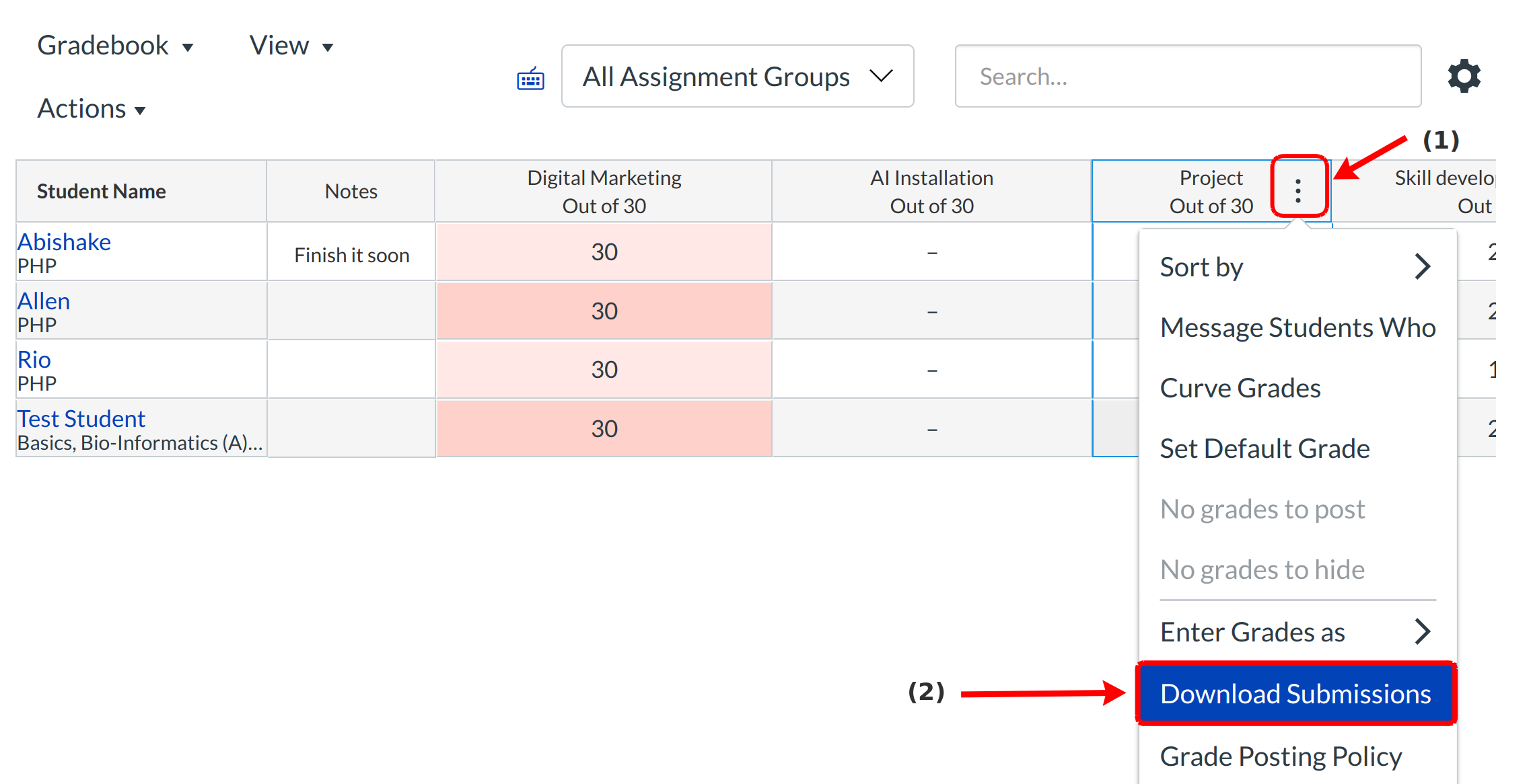Click the Download Submissions link [2] to download all the assignment submissions as a .zip file.