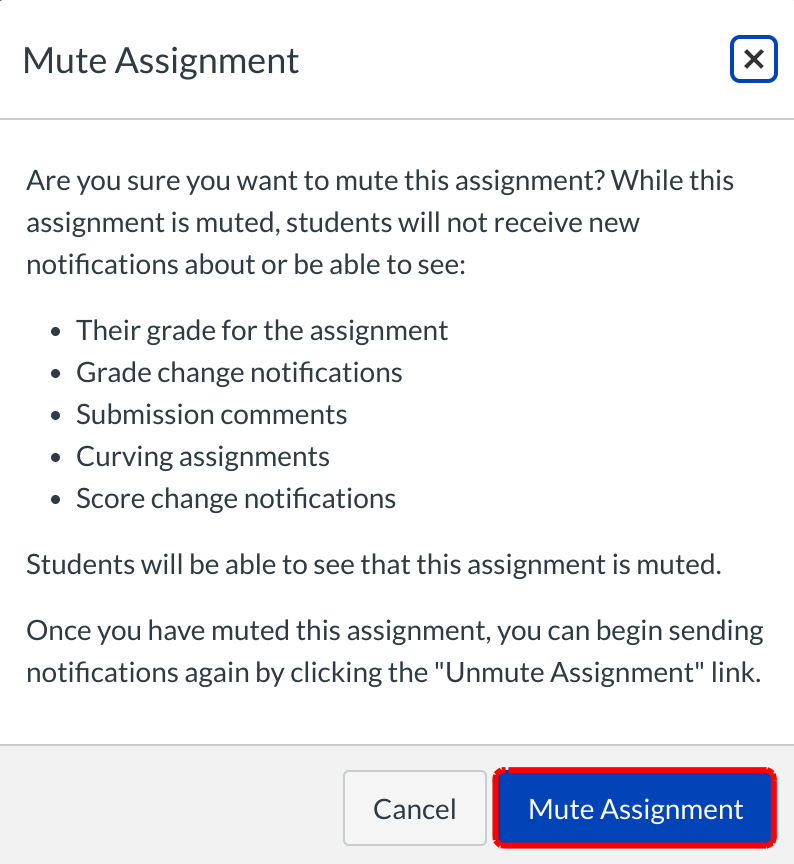 Click the Mute Assignment button. Students will be unable to view their grades, including grade and score changes, submission comments, and curved assignments for the assignment.
