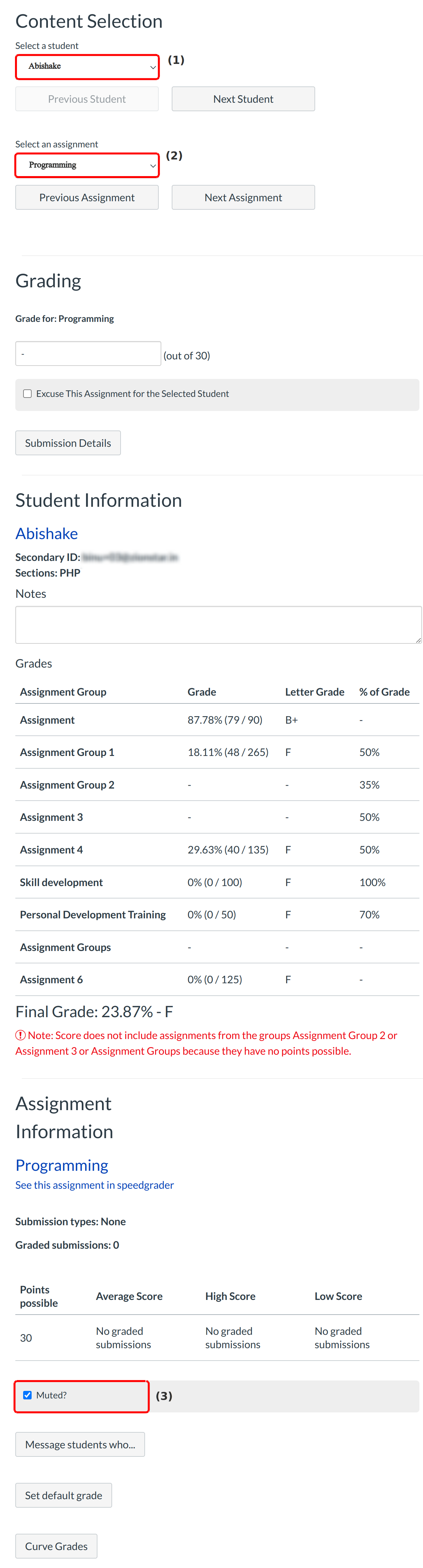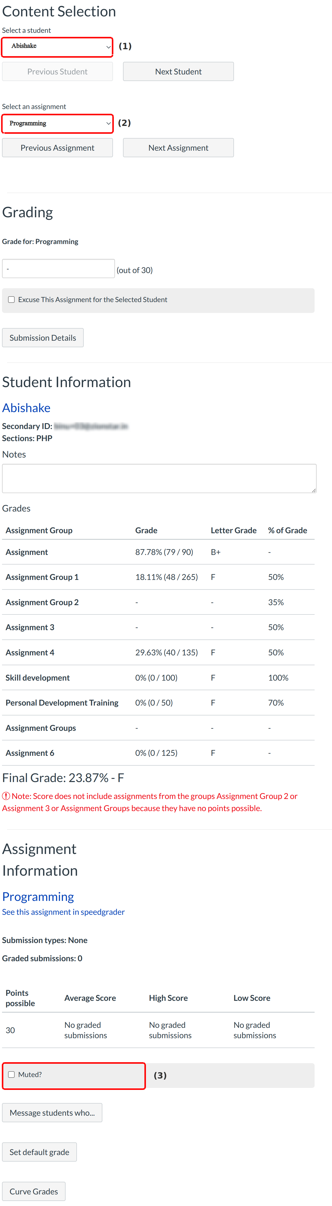 In the content selection click the drop-down menu for select student name and assignment [1] and [2] respectively from Gradebook Individual view. At the bottom of the page, click the Muted? checkbox for mute the assignment [3].