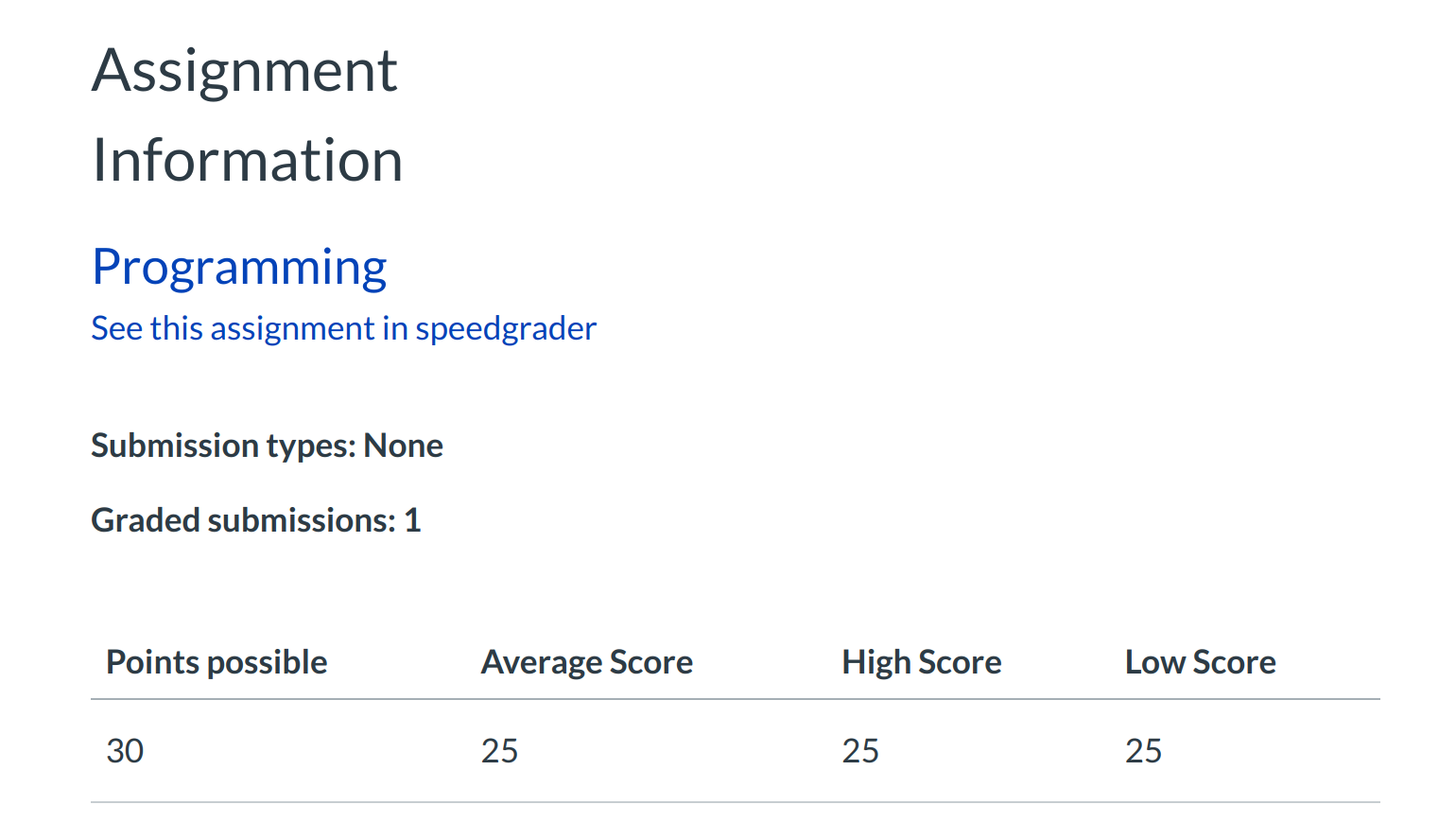 View the details for the assignment. You can see the Possible points, average score, high and low score, and the number of total graded submissions.