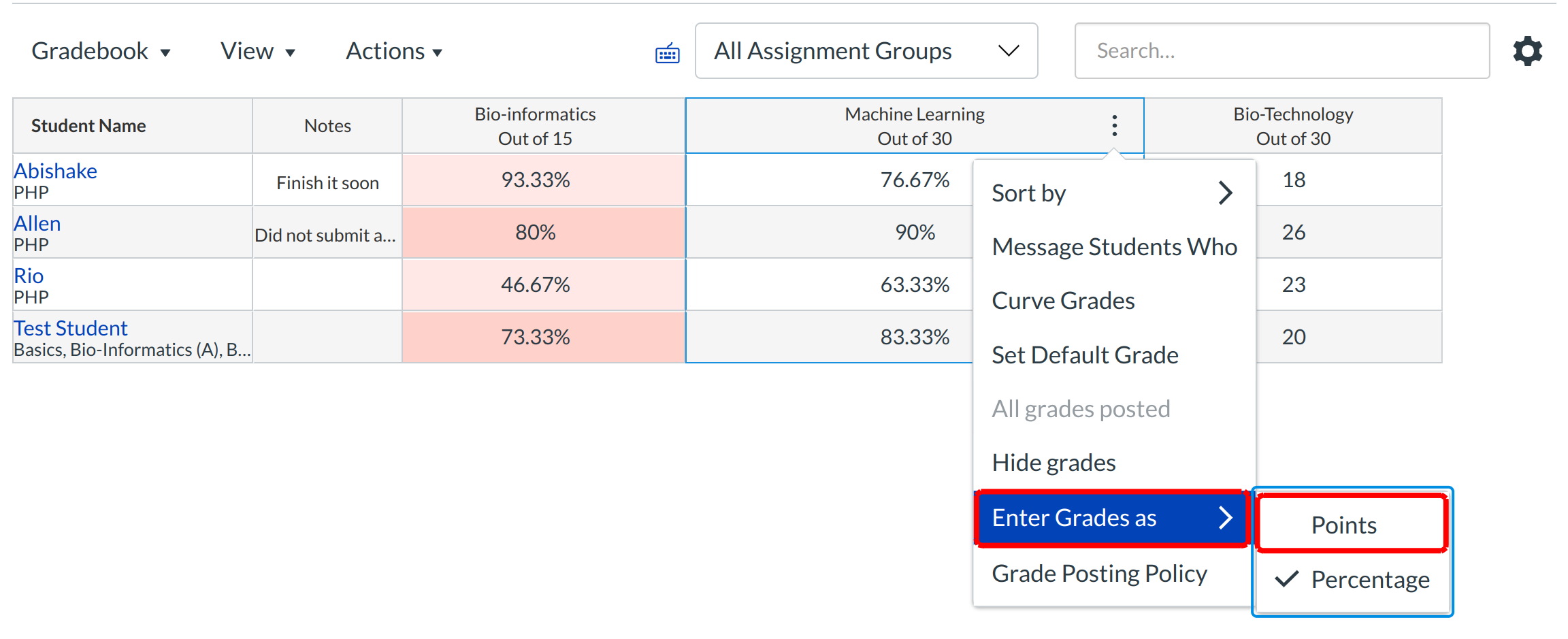 Click the three-dot icon and select the Enter Grades as menu option. Then it shows an another dialogue box for choosing the points and percentage. Select the type of value you need.