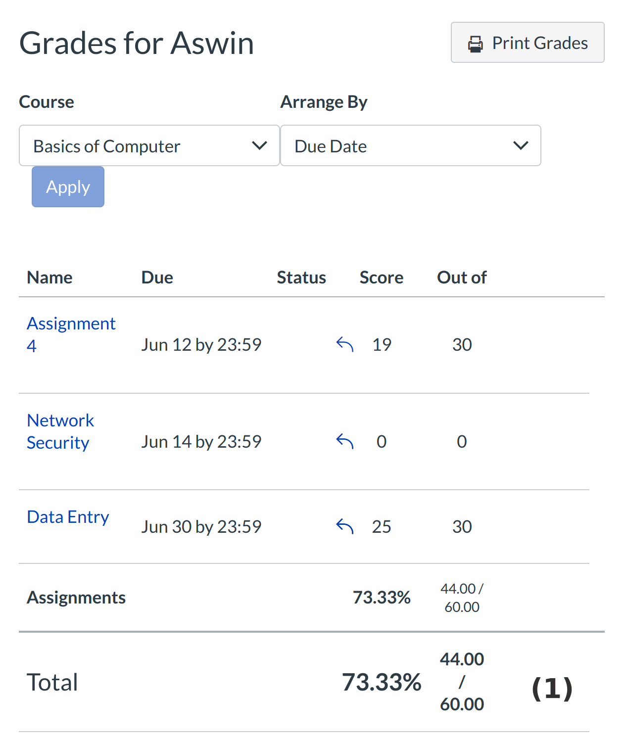 The total grade is calculated by adding up all the assignments according to their weight in the grading scheme. This grade is only displayed if the student or instructor unchecks the Calculate based only on graded assignments checkbox.