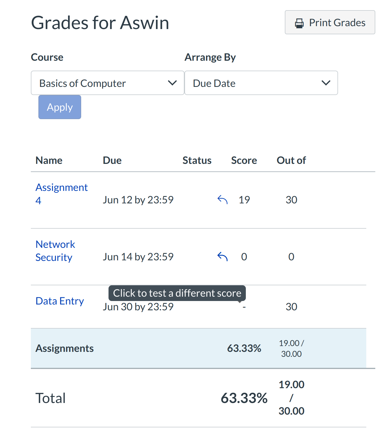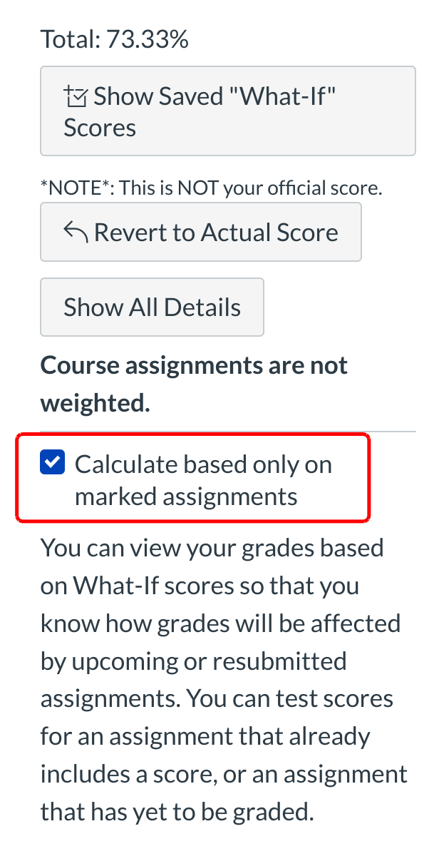 What-If Grades allow students to calculate their total grade by entering hypothetical grades for all ungraded assignments.