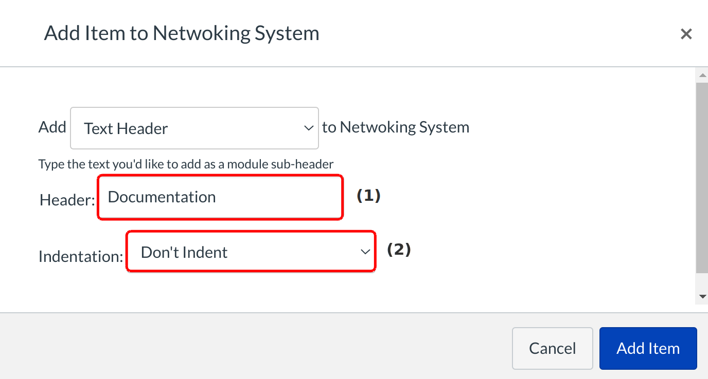 Type the text you wish to add in the header field [1]. Open the Indentation drop-down menu and select the level of indentation for the text header [2].