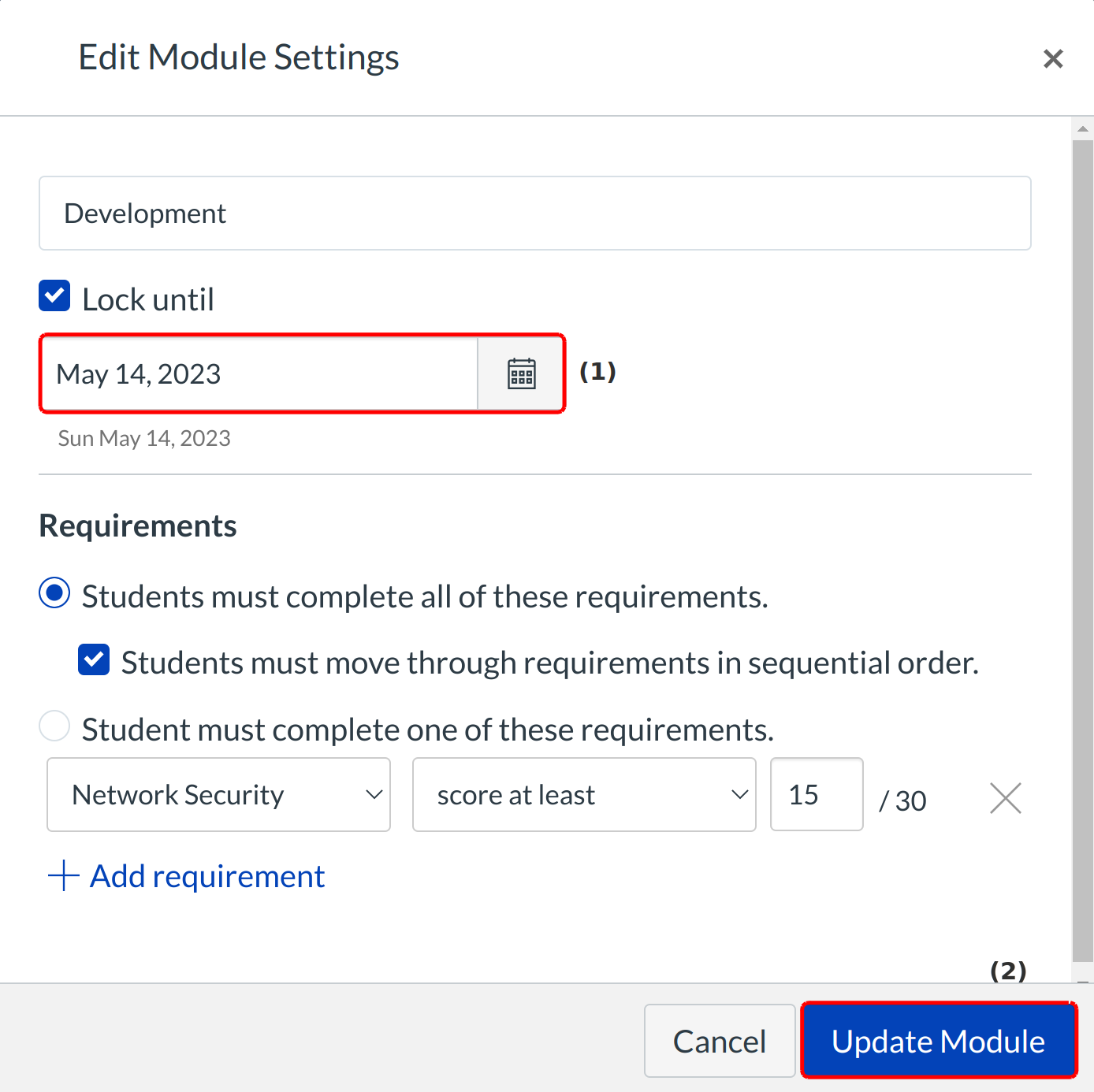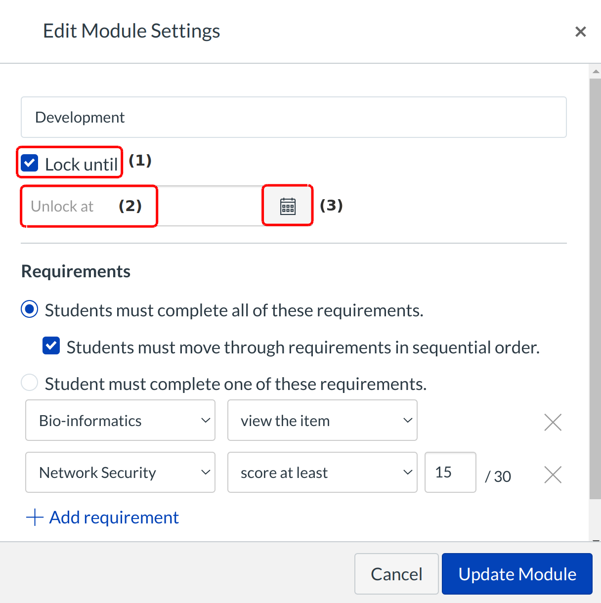 Type the date in the Unlock at field [2] or select the Calendar icon [3] to set the date when the module will unlock.