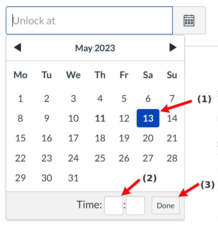 Set the date and time the module will unlock at by clicking on the day [1], typing the time in the time field [2], and clicking the Done button [3].