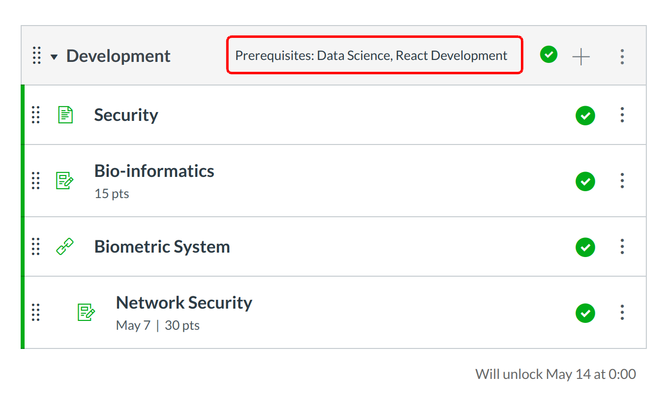 Prerequisites are defined by associated requirements in a module, meaning that students must complete all requirements within one module before moving to the next module. Without setting requirements in order, prerequisites do not serve a purpose. Note that you cannot prevent a student from accessing an upcoming module unless prerequisites have been set for the prior modules.