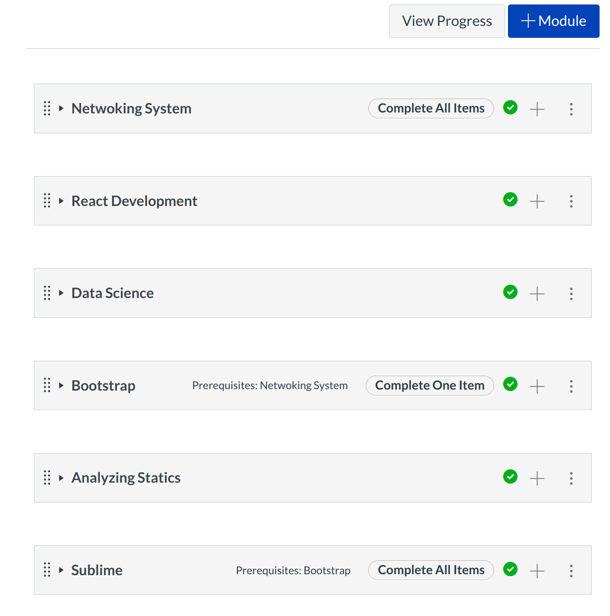 Modules are used to organize course content by weeks, units, or a different organizational structure that works for your course. With modules, you are essentially creating a one-directional linear flow of what you would like your students to do.
