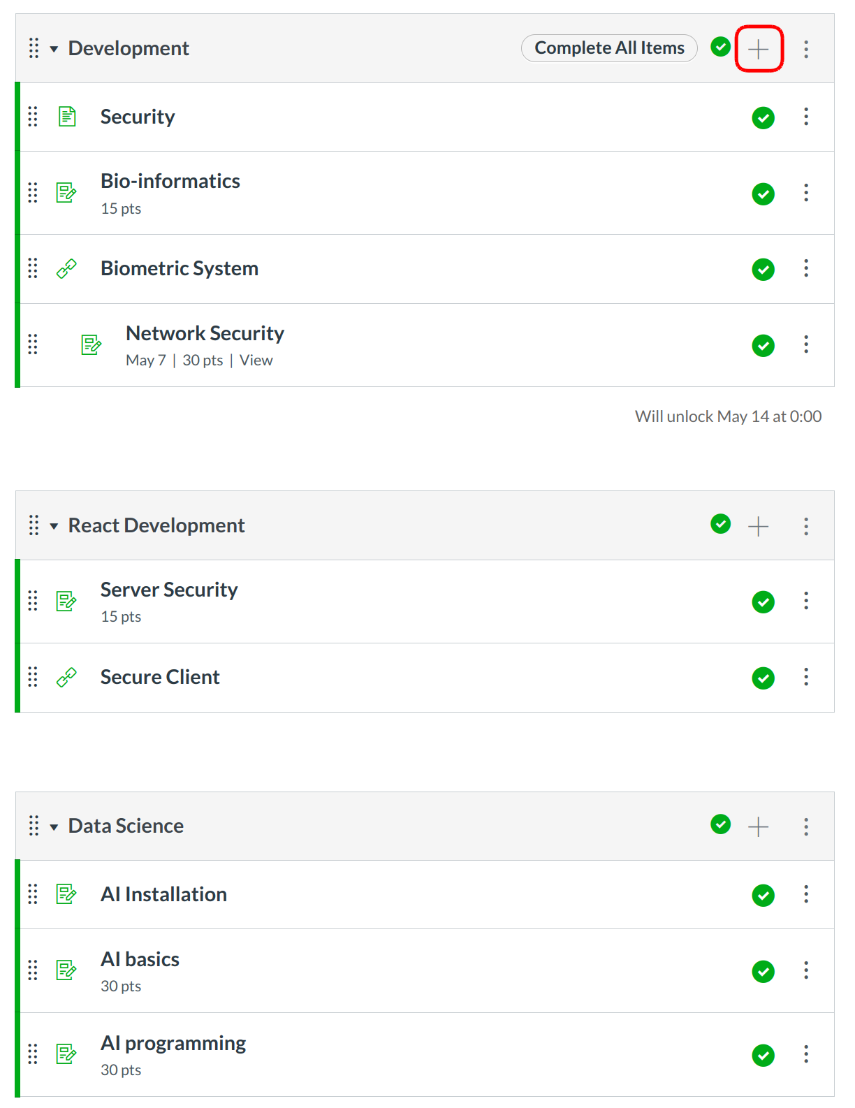 Each module can contain files, discussions, assignments, quizzes, and other learning materials that you would like to use. You can easily add items to your module that you have already created in the course or create new content shells within the modules. Course content can be added to multiple modules or iterated several times throughout an individual module. Modules can be easily organized using the drag and drop feature. Elements within the modules can also be reorganized by dragging and dropping.
