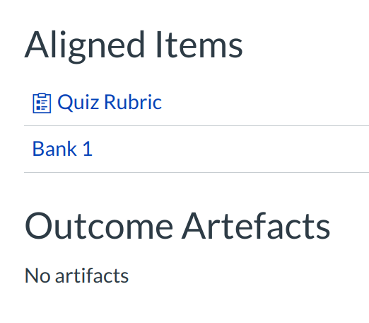 View any aligned items, like assignments or rubrics or outcome artifacts below their respective headings.