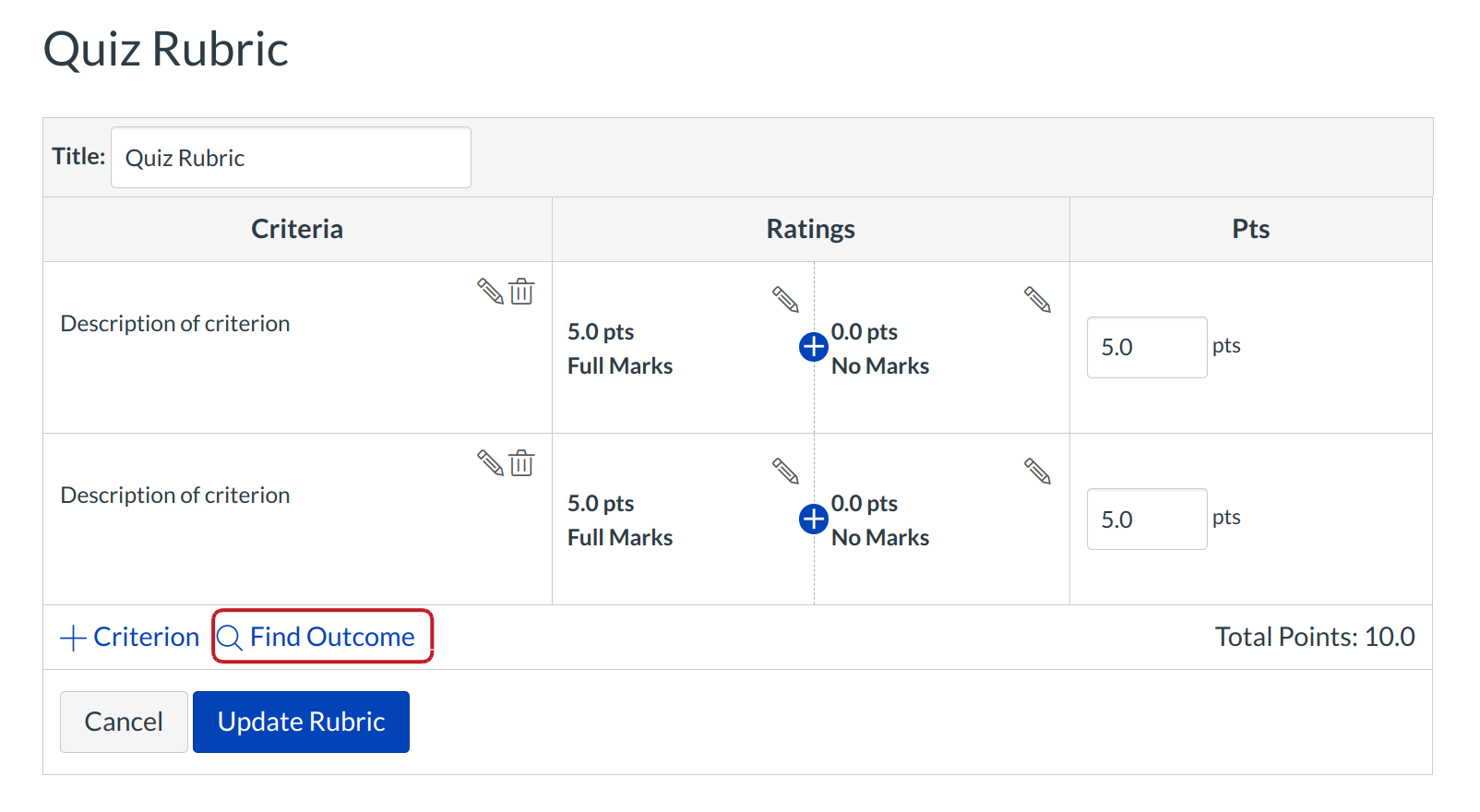 Click the Find Outcome Criterion link to align an Outcome with the rubric. A pop up window will appear in your browser.
