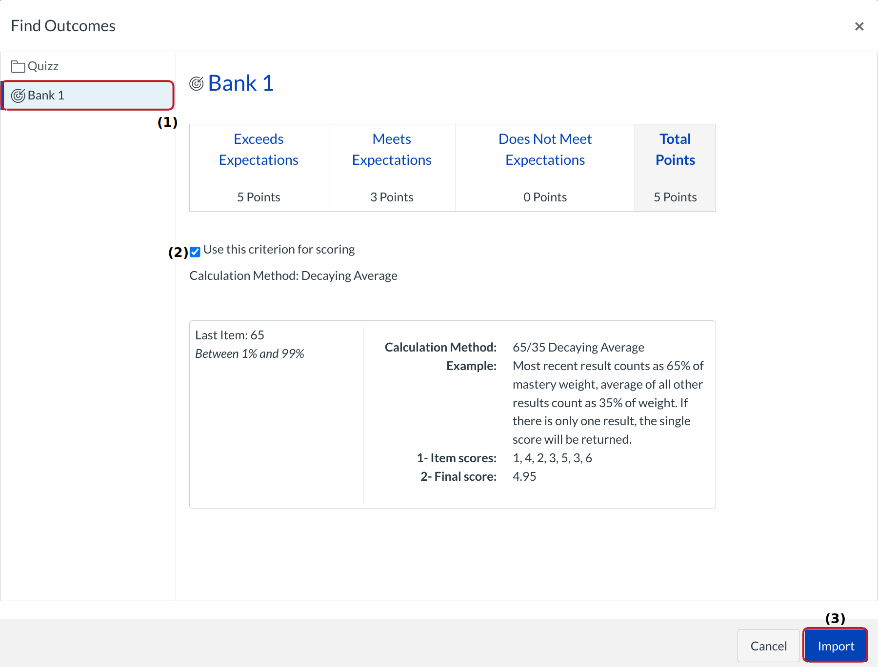 Choose the outcome you wish to align [1] and decide if you want to use the criterion for scoring [2]. Click the Import button [3].
