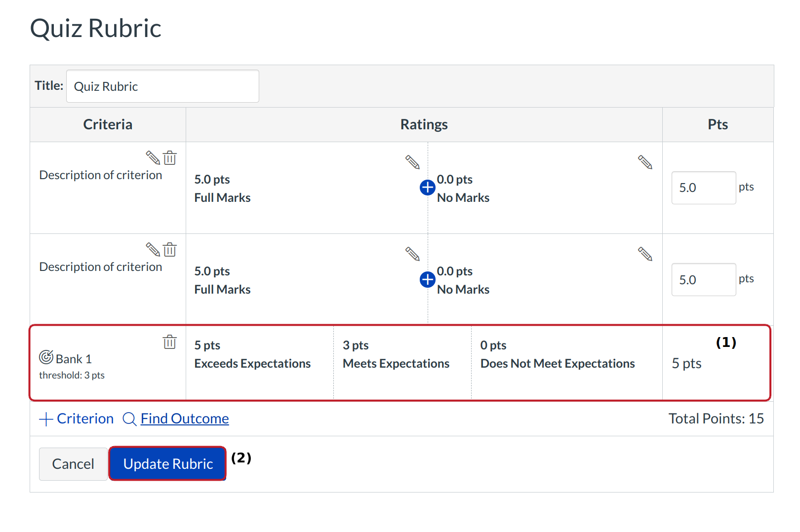 View the aligned outcome [1]. Click the Update Rubric button [2].