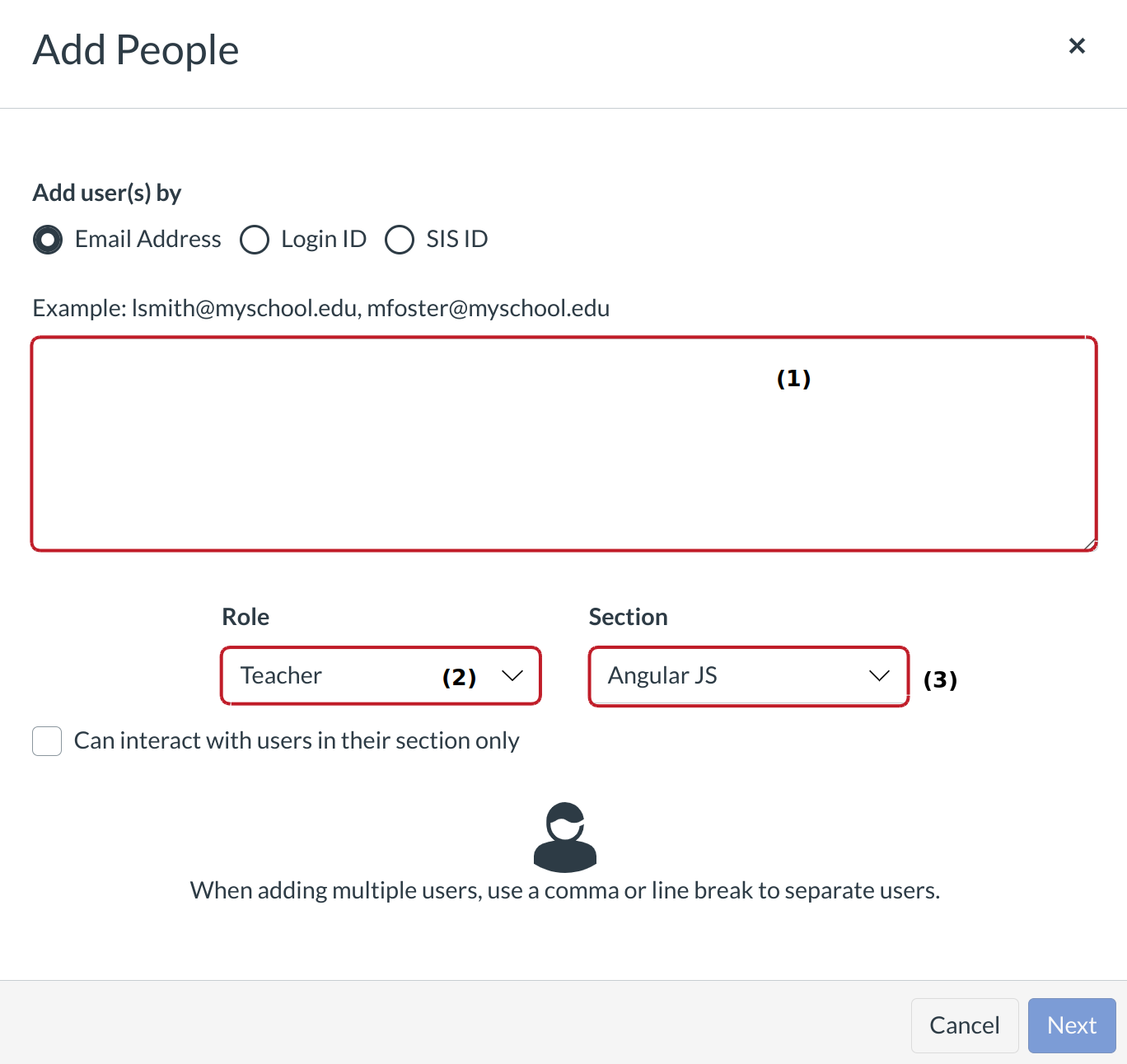 The Admin types or pastes an email address or several email addresses in the type field [1]. Users will be assigned a role in the Role drop-down menu [2] and a course section in the Section drop-down menu [3].