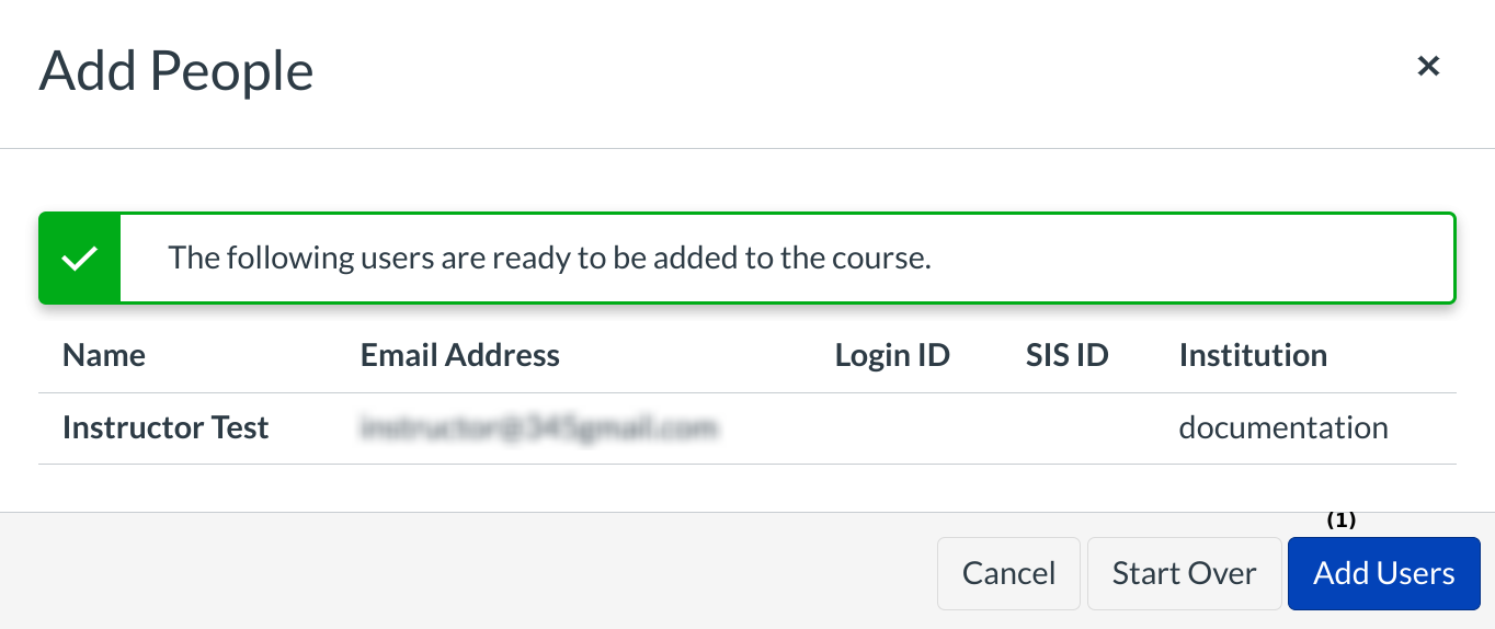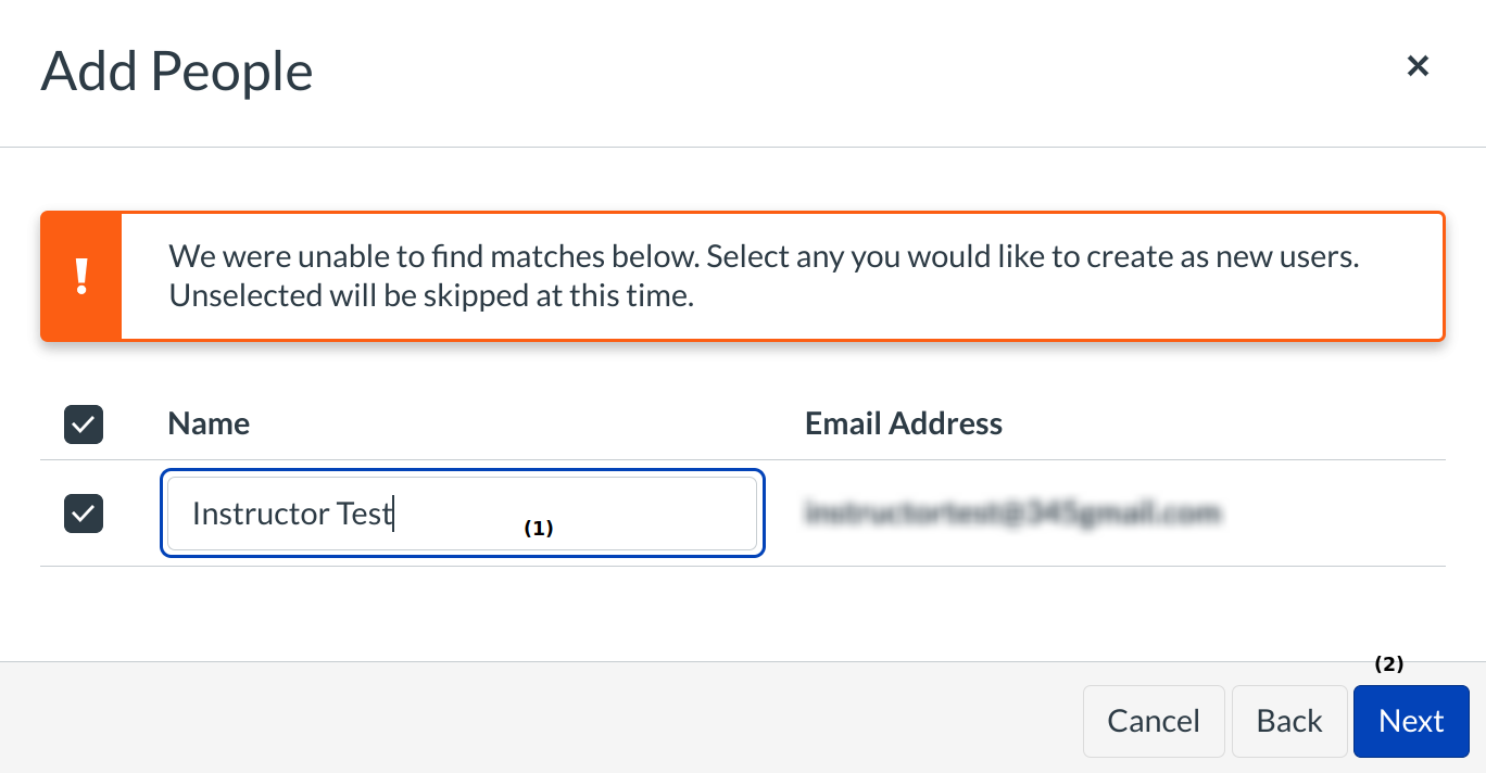 After advancing to the next menu, LMS will verify that the email is a valid email address [1]. Once confirmed, the admin will add the users to the course roster with the Next button [2].