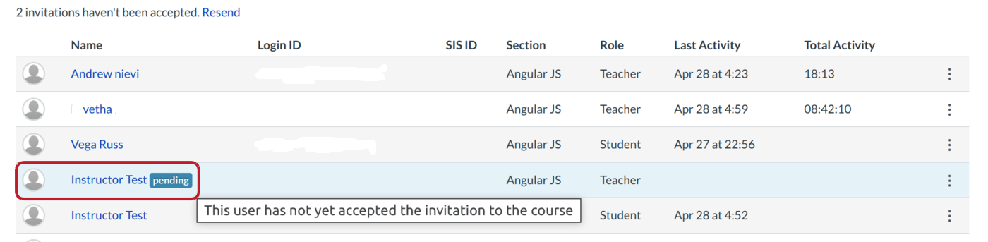 The admin will see the user's status pending until the user accepts the course invitation.