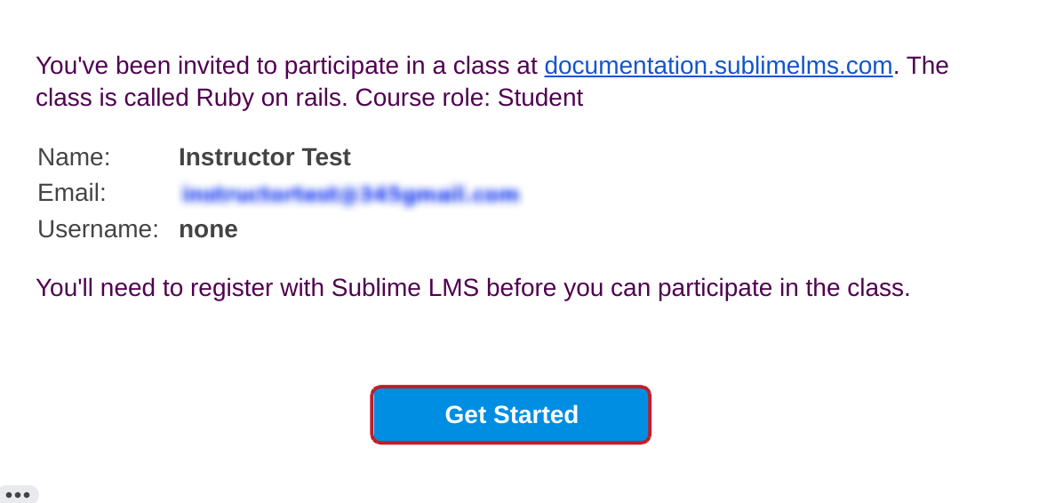 Instructor will receive an email that contains institution's URL [1] and Instructor's email address to use for login [2]. To accept the course invitation, click the Click here to get started link [3].