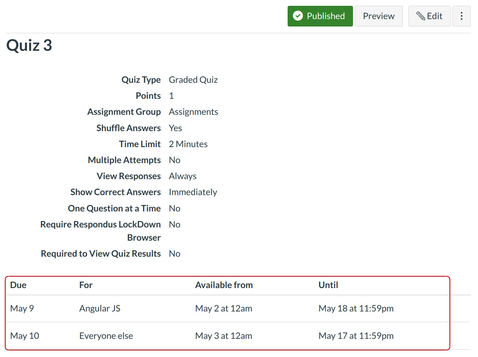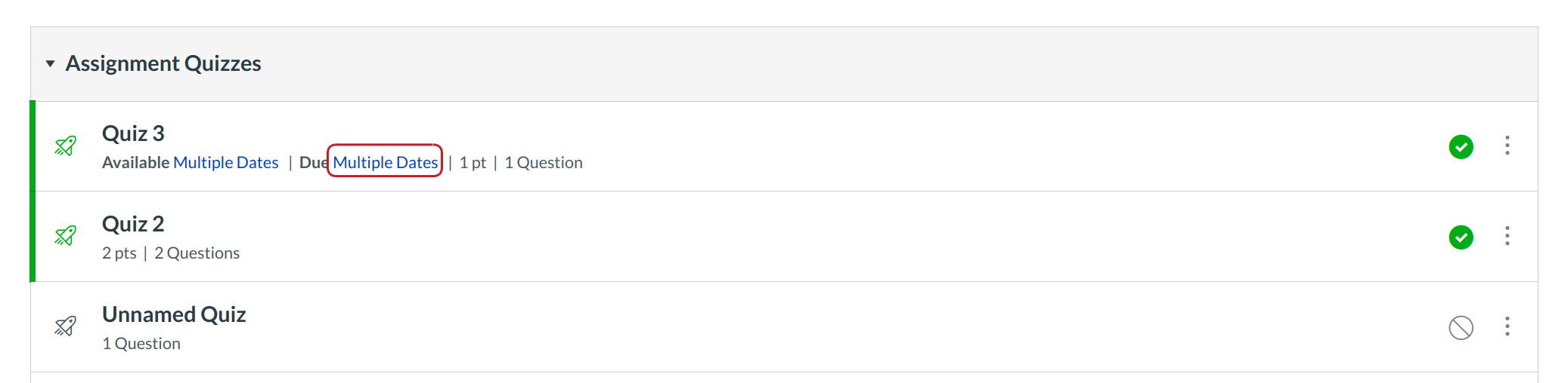 View Quiz with Multiple Due Dates on Quizzes Page.