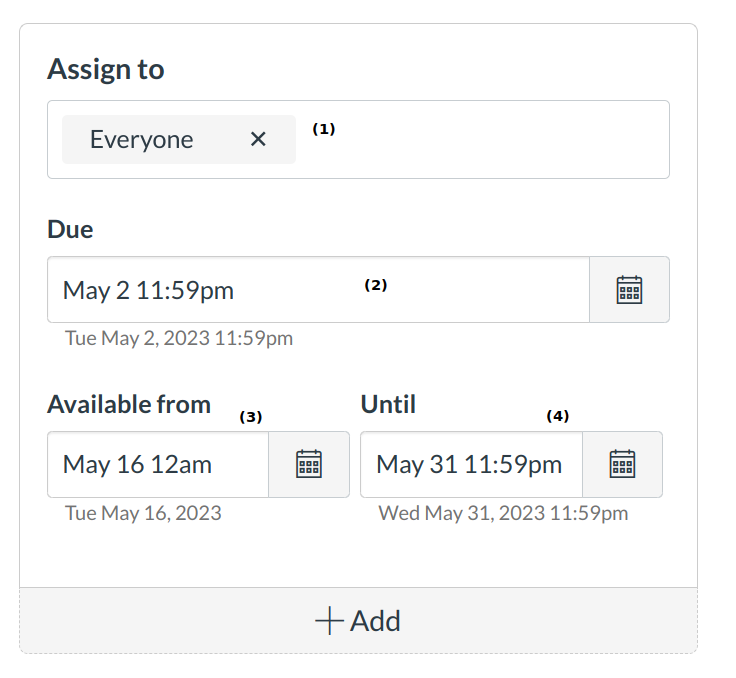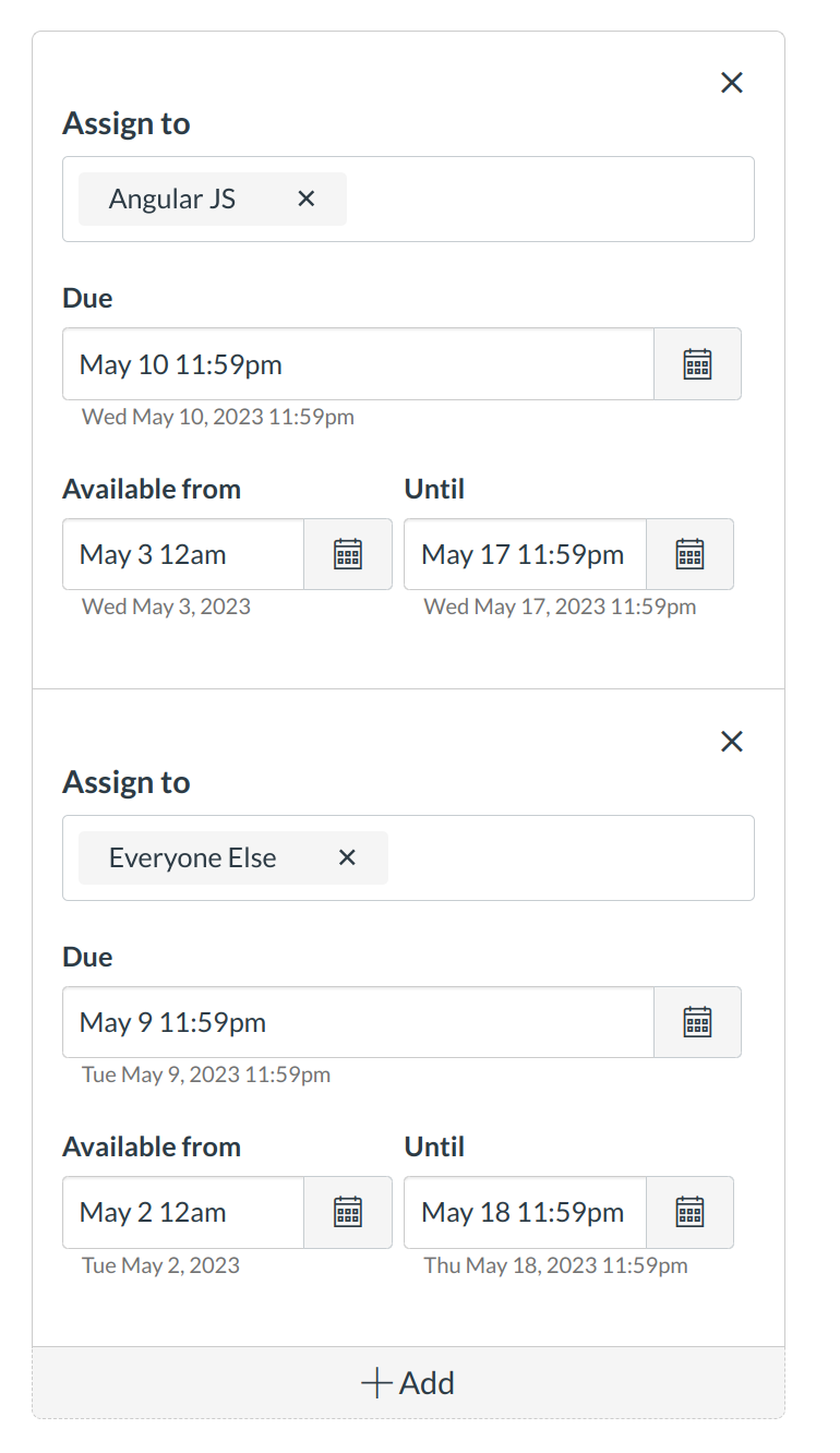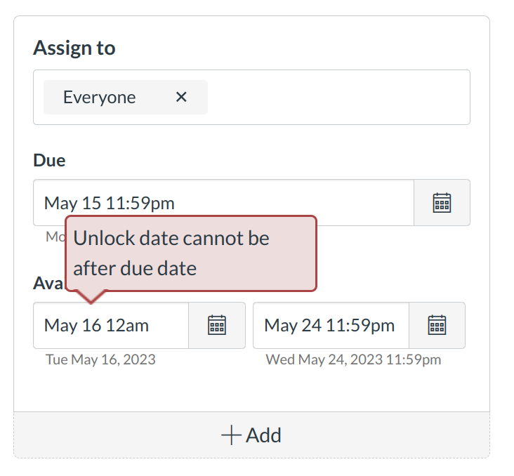 Users will receive a notification when they submit an invalid string of due dates for a Quiz, Assignment, or Graded Discussion. Such invalid entries include not unlocking the assignment before it is due, or not placing the due date inside the range of availability dates.