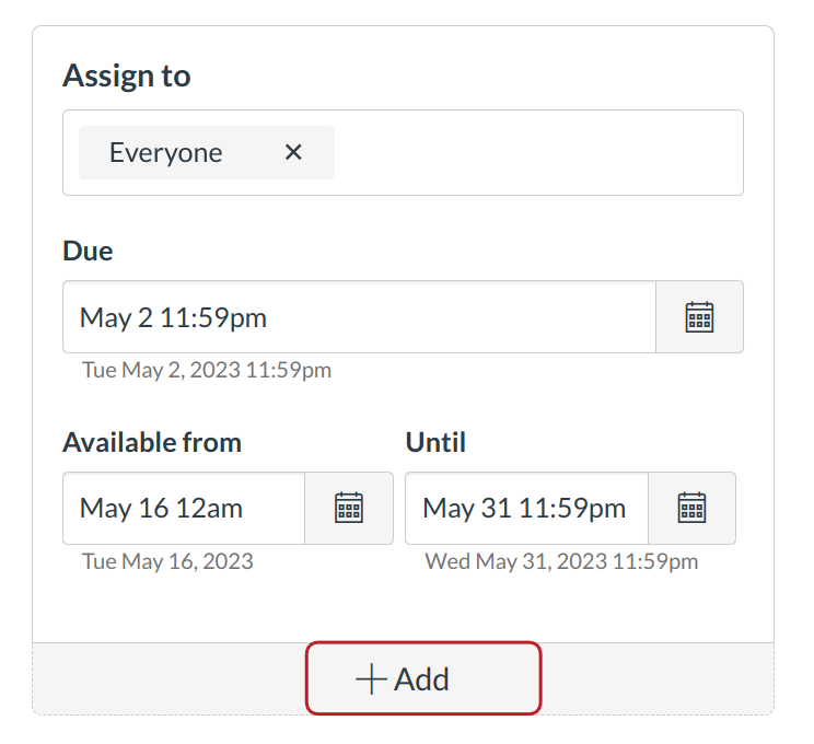 Set the new Due Date for the additional section by changing the For, Due Date, Available From, and Until fields.