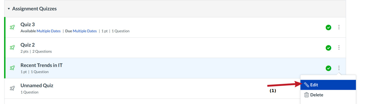 Click the pencil icon [1] next to the quiz you want to edit.