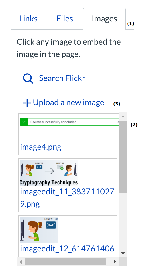 You can add course images into your quiz questions. Place your cursor where you want to embed the image. Click the Images [1] tab in the Content Selector. Search for the image [2] you want to add and click on it to embed it in the Rich Content Editor. You can also upload a new image or find images on flickr [3].
