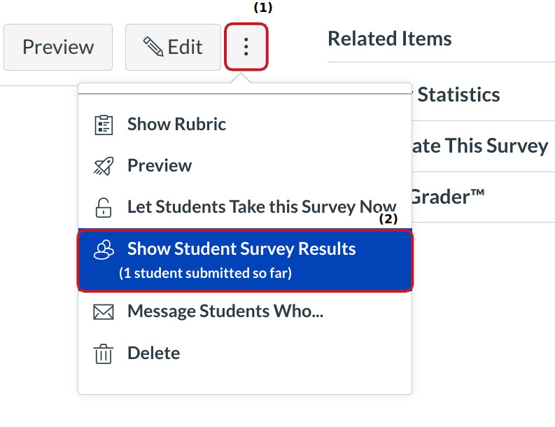 Click the Gear icon [1] and select the Show Student Survey Results link to view individual submissions [2].