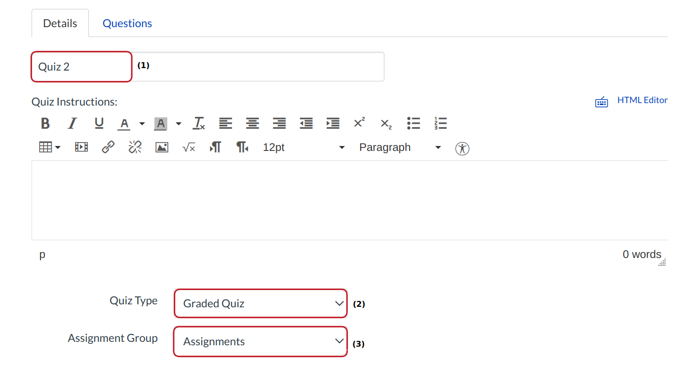 - Categorize the quiz into the proper Assignment group. You can create Assignment Groups within Assignments.