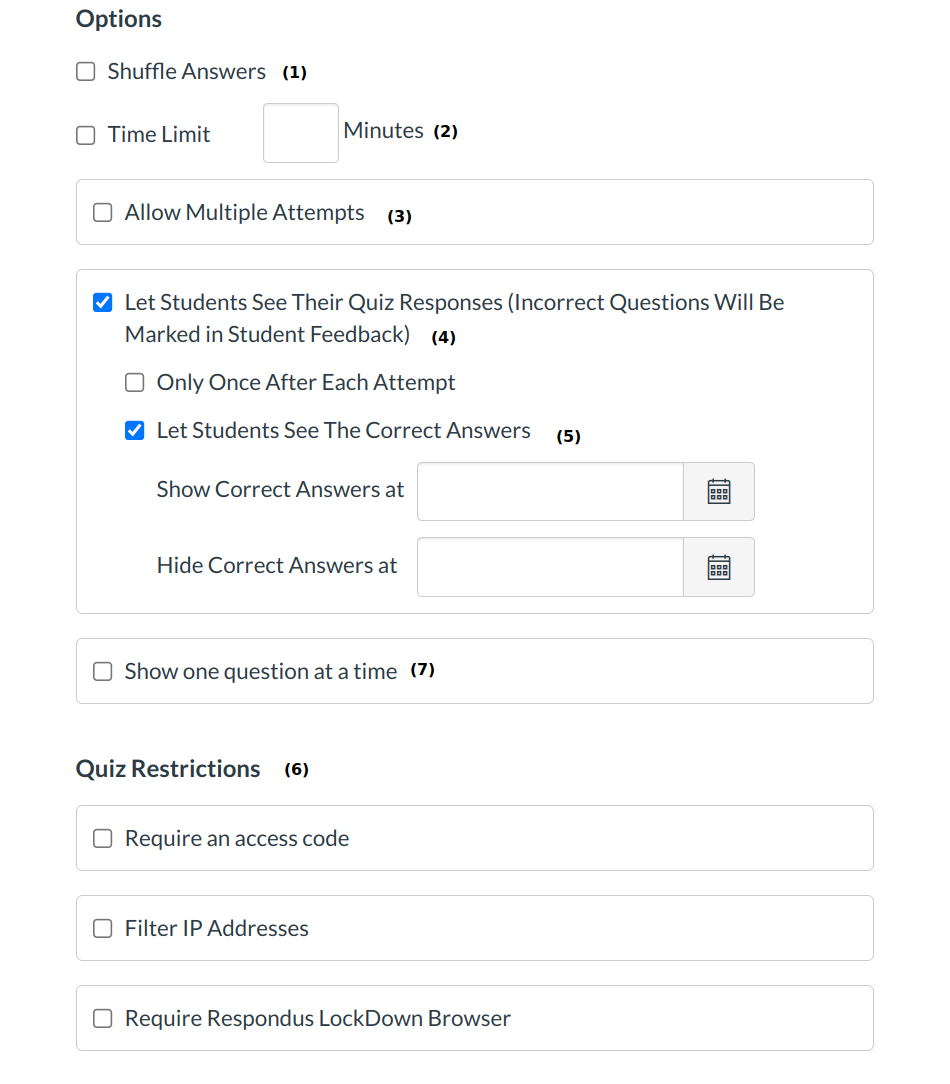 By default, quizzes will always let students see their quiz responses and see which answers were correct (options 4 and 5). If you do not want students to have these options, you will have to uncheck the boxes.