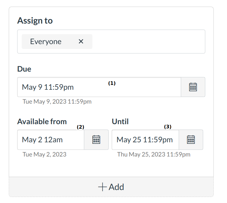 You can set the Due Date [1], Available From date [2], and available Until date [3] for the quiz.