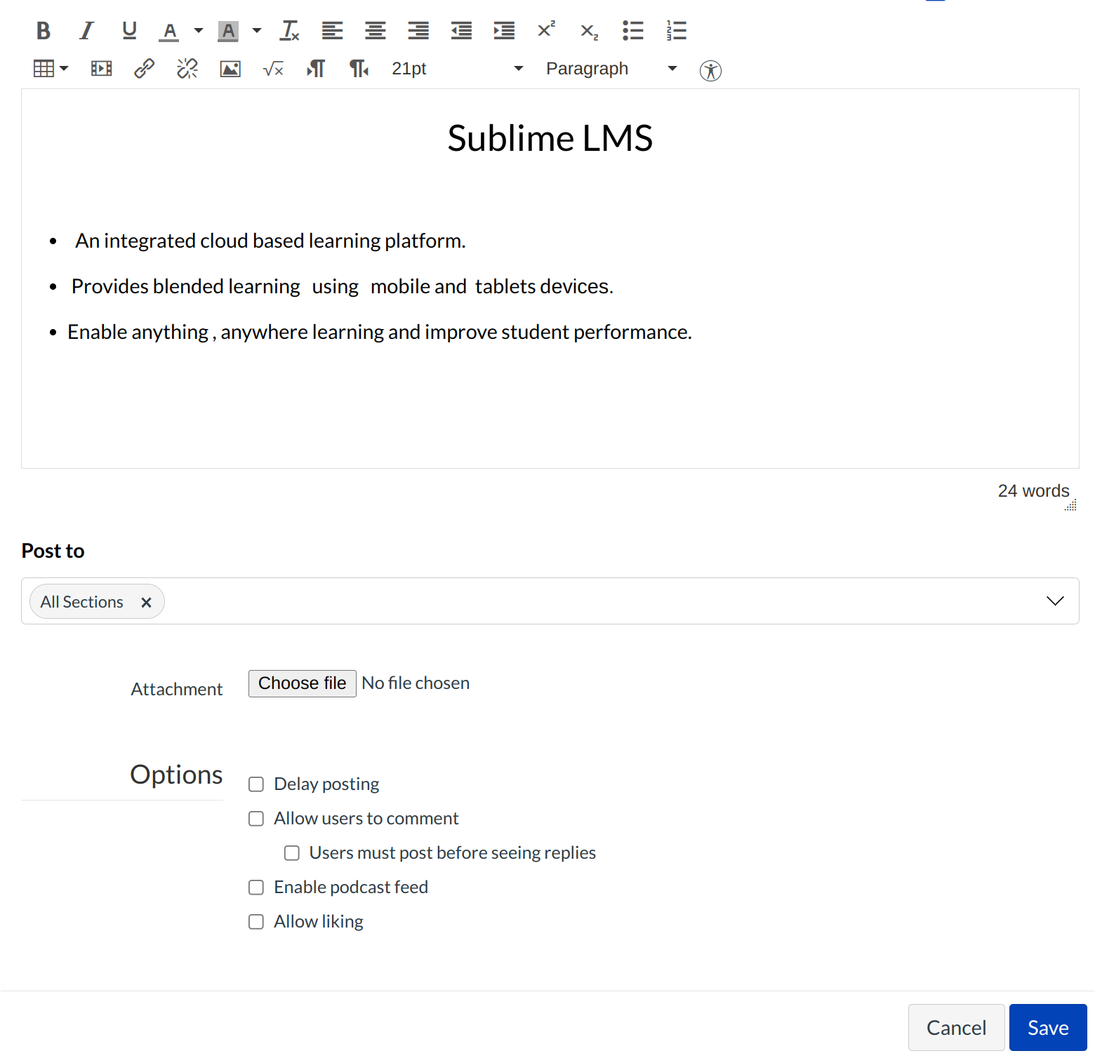 Open the Rich Content Editor using one of the Sublime LMS ™ features which support the Editor.