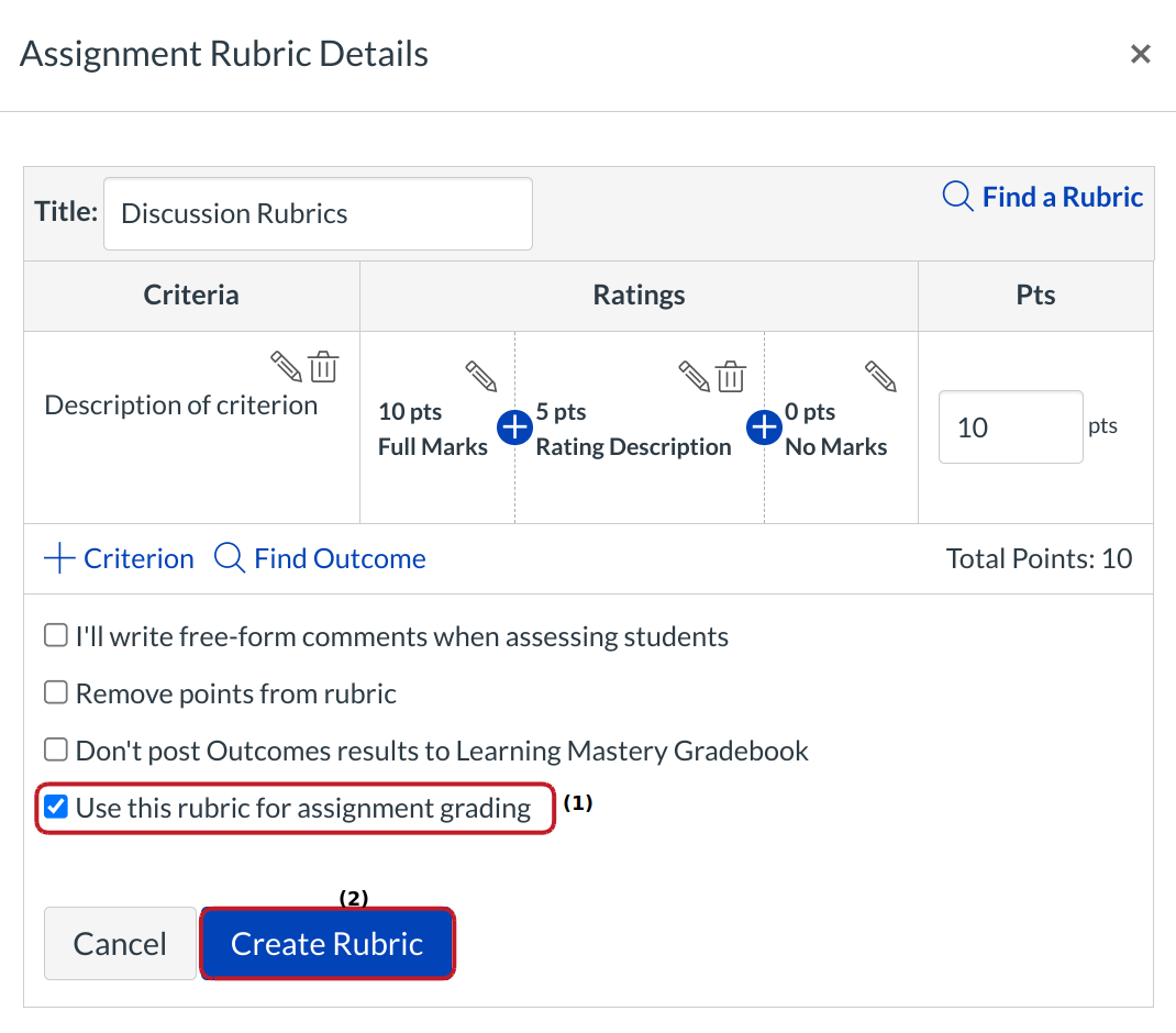 Now you can edit rubric details. If you want the discussion to be graded, select the Use this rubric for assignment grading check box [1]. When you're finished editing the rubric, click the Create Rubric button [2].