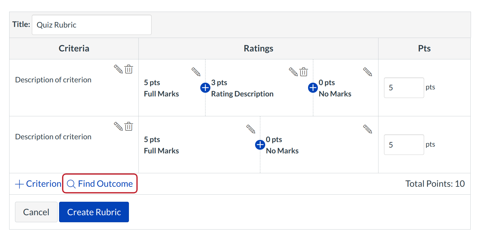 Click the Find Outcome Criterion link to align course or account-level outcomes with the rubric.