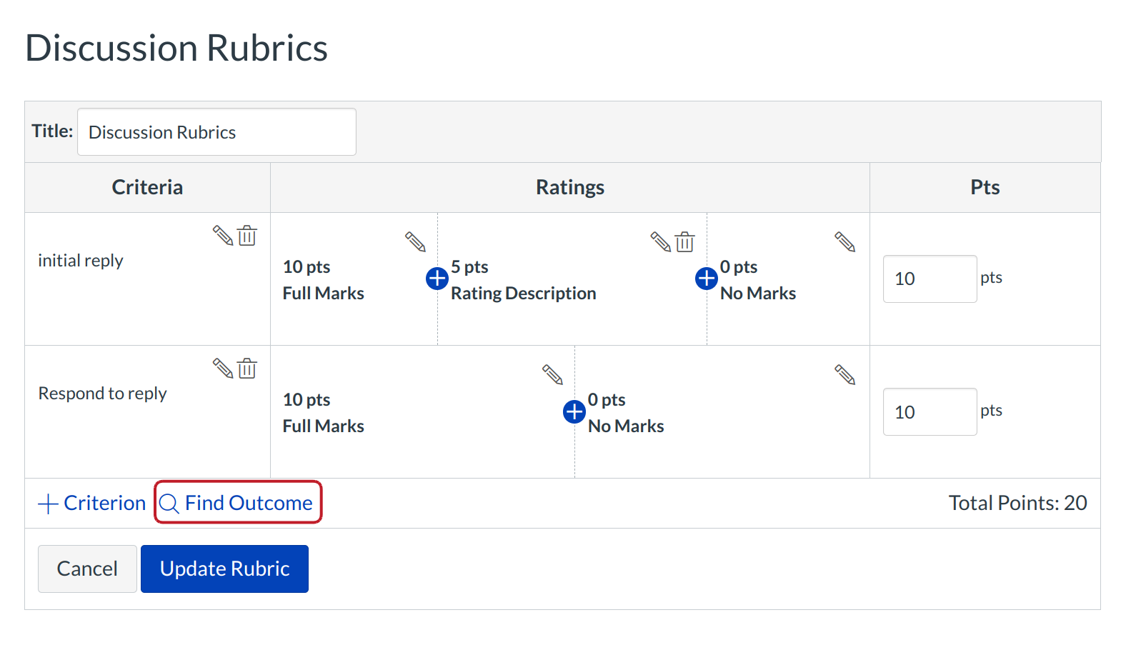 Click the Find Outcome Criterion link to align course or account-level outcomes with the rubric.