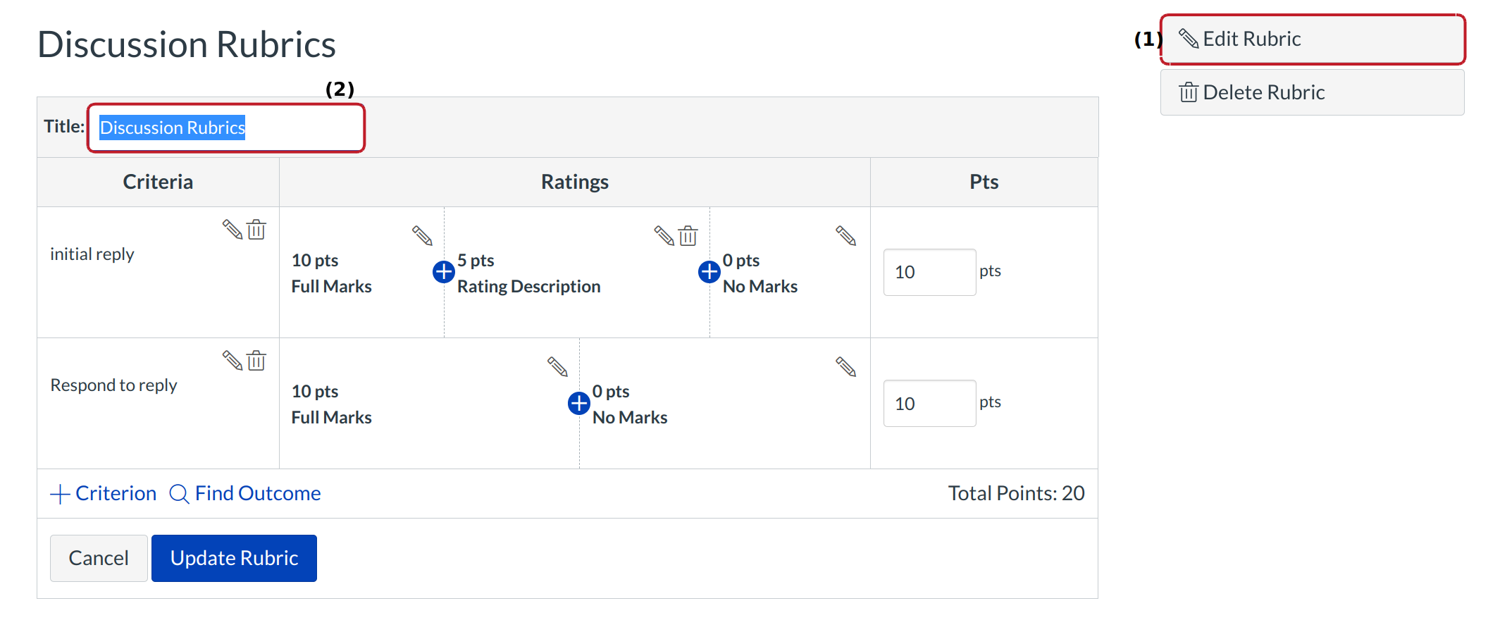 Click Edit Rubric[1]. Edit the rubric title by typing in the title field [2].
