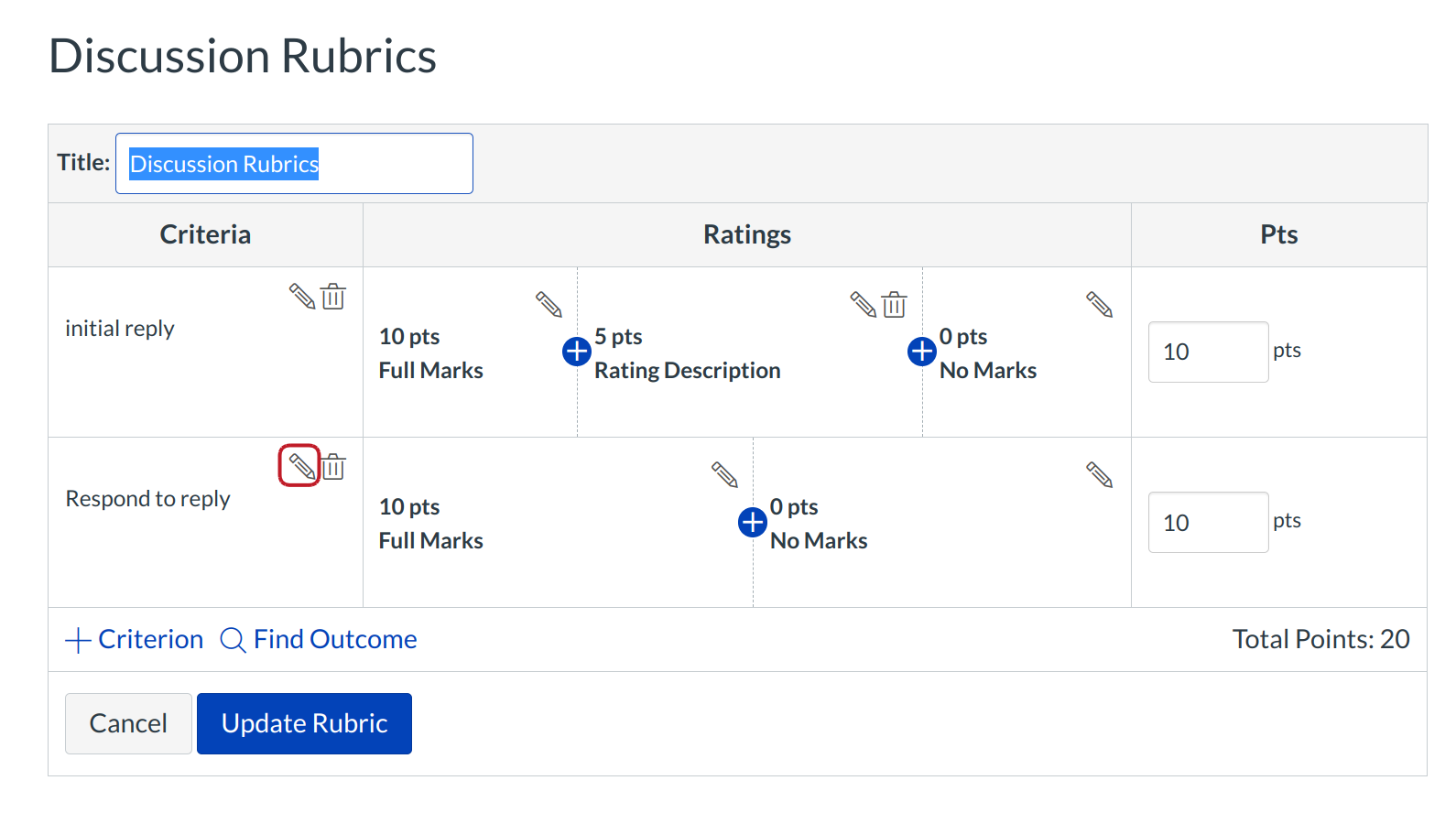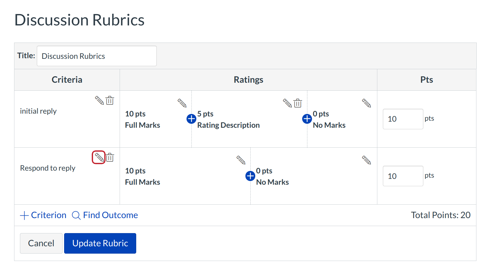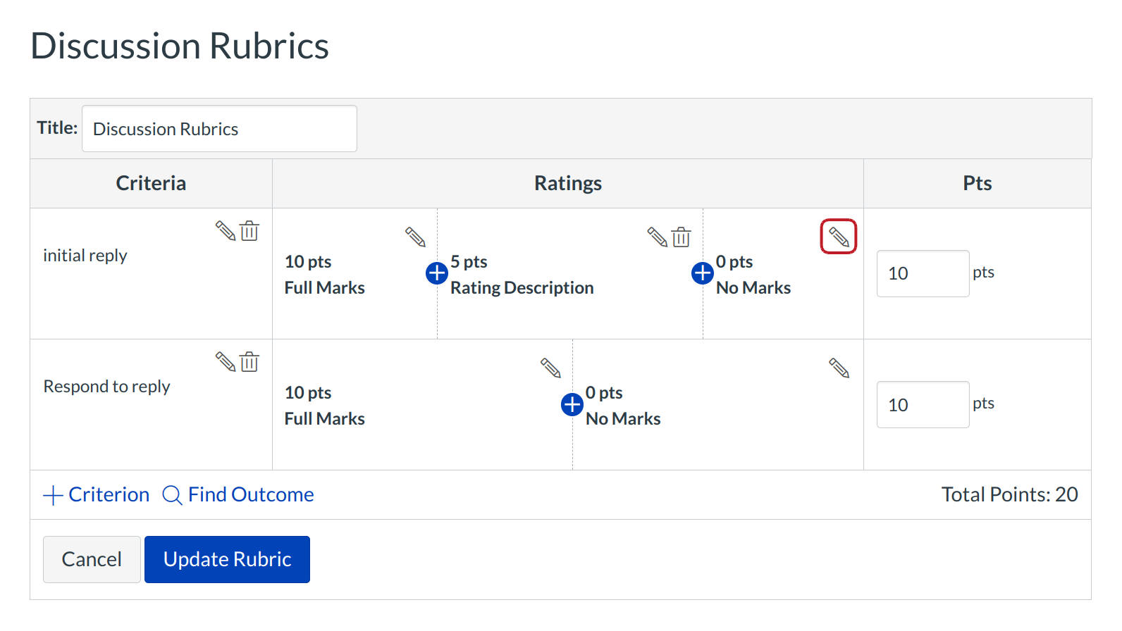 Hover over the rubric rating you wish to edit. Click the Pencil icon to edit the rubric rating.