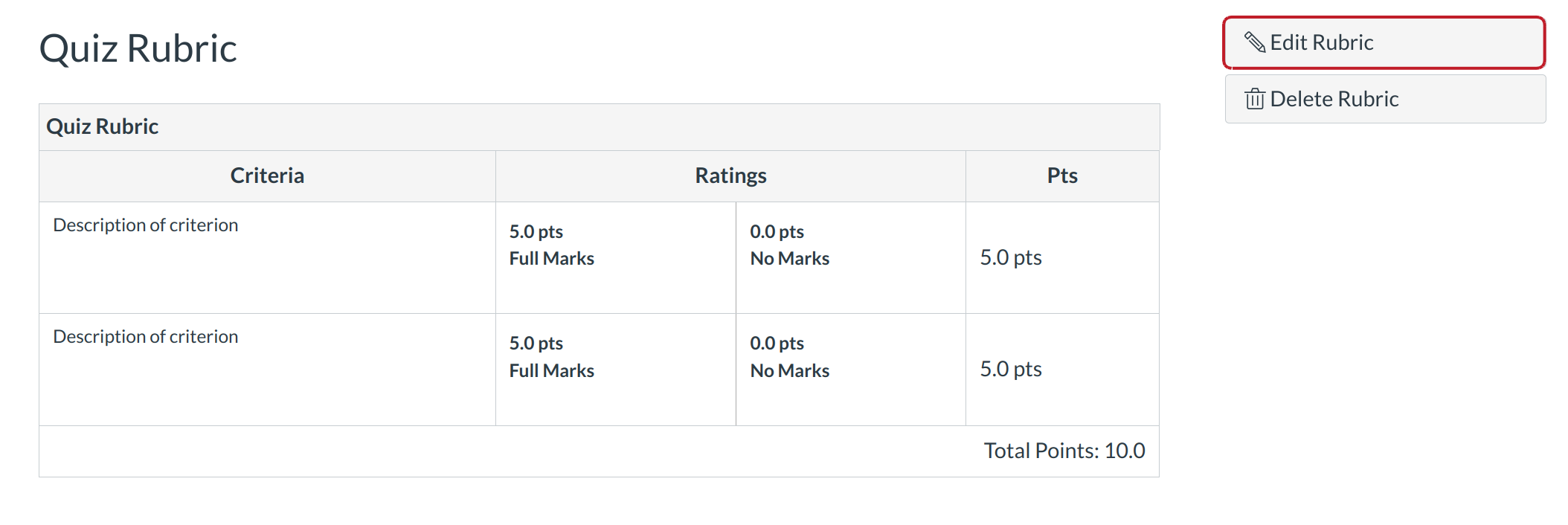 You will be able to view all the rubrics for the course.Click the rubrics course title. You can edit the rubric by clicking on the Pencil icon.