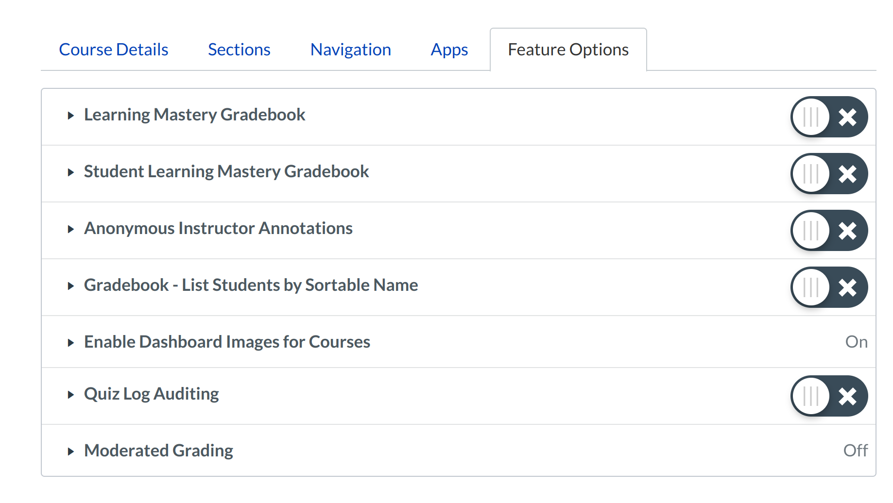 If a feature is turned on by your admin, the feature will display as Enabled. Your course will be required to use this feature.