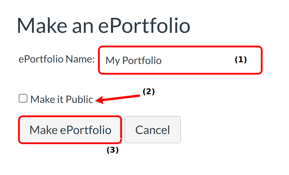 Name your ePortfolio by typing in the ePortfolio Name field [1]. Decide if your ePortfolio will be public [2] (you can change this setting later) and then click on the Make ePortfolio button [3].