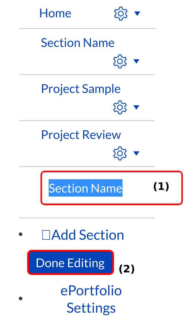 Type your new section name in the section name field [1]. Press Return (on a MAC keyboard ) or Enter (on a PC keyboard). The section name will show up in your navigation links. Click Done Editing [2].