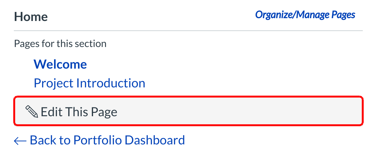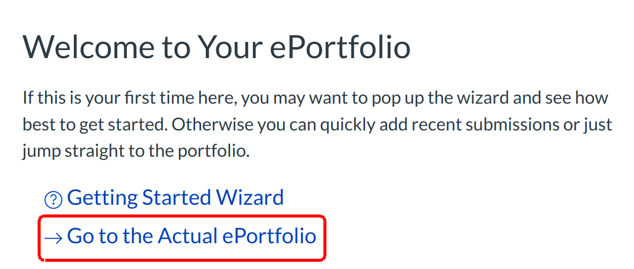Click the Go to the Actual ePortfolio link to open your ePortfolio. The ePortfolio will open to the default page.